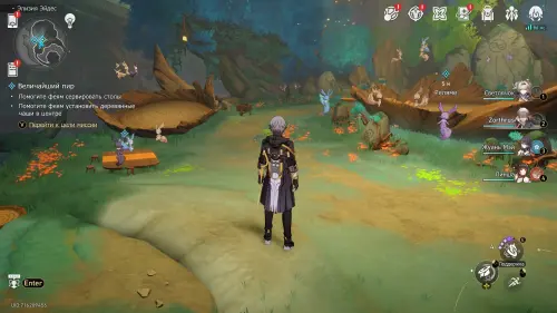 Девушку позовет староста, поэтому вы останетесь одни. Пообщайтесь со своими друзьями перед началом пира. Они все будут отмечены маркерами. После разговора с ними вступите в диалог с деревенской старостой. Гляньте новую кат-сцену, после чего пир подойдет к концу, и вы возвратитесь в основную часть Элизии Эйдес.