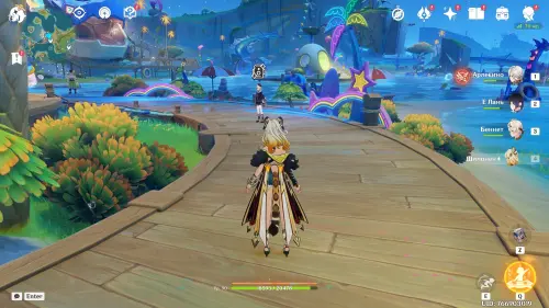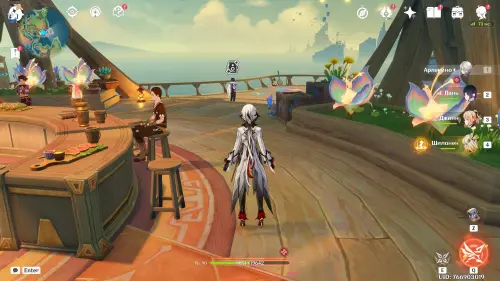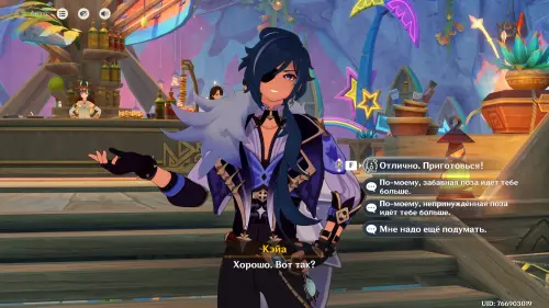 Телепортируйтесь к северной путевой точке острова Тете (Курорт «Оазис отдыха»), а затем пройдите в дальнюю часть бара, и вы увидите тут Кэйю. Прежде чем подходить к нему, установите время на 19:00 – 23:00 и выберите любого персонажа с двуручным мечом (подойдет и бесплатная Ноэлль) или Путешественника.