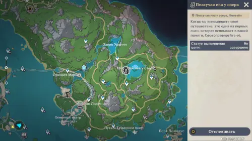 Телепортируйтесь в одноименную локацию, расположенную в Лесу Эриний (Фонтейн), и отыщите здесь светящийся маркер под деревом. Прежде чем вставать на него, выберите любого персонажа Гидро стихии: подойдет бесплатная Барбара или Путешественник (Гидро).