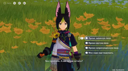 Переместитесь к телепорту к западу от Беззаботной ярмарки (Курорт «Оазис отдыха»), а затем бегите на северо-запад и поговорите с Тигнари. Выберите для него любую понравившуюся позу. Прежде чем соглашаться на фотосъемку, возьмите любого лучника (подойдет бесплатная Эмбер) или Путешественника, а затем переведите время на отрезок между 12:00 и 16:00.