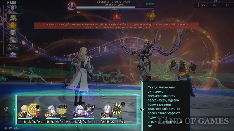 - Обязательно возьмите хотя бы одного персонажа Сохранения или Изобилия: босс часто использует массовые атаки, а состояние «Антиномии» способно сносить союзникам до 50% от их макс. ХП. Щиты или стабильное лечение сильно упрощают выживание;