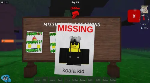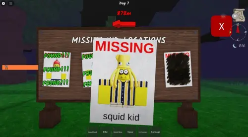 Уже в первый день вы сможете отыскать рядом со своим костром информационную доску, на которой будут висеть постеры с пропавшими детьми. Вам необходимо будет отыскать четырех ребятишек: Малыша-дино (Dino Kid), Малыша-кракена (Kraken kid), Малыша-кальмара (Squid Kid) и Малыша-коалу (Koala Kid).