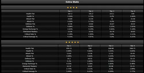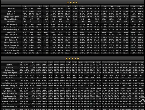 В таблицах ниже приведены возможные значения статов при прокачке артефакта.