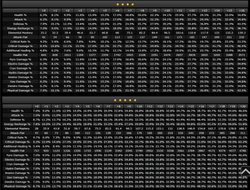 В таблицах ниже показаны значения, которые могут приобретать статы артефакта при его прокачке.