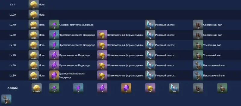 Уровень | Базовое HP | Базовая атака | Базовая защита | Бонус к крит. урону |
