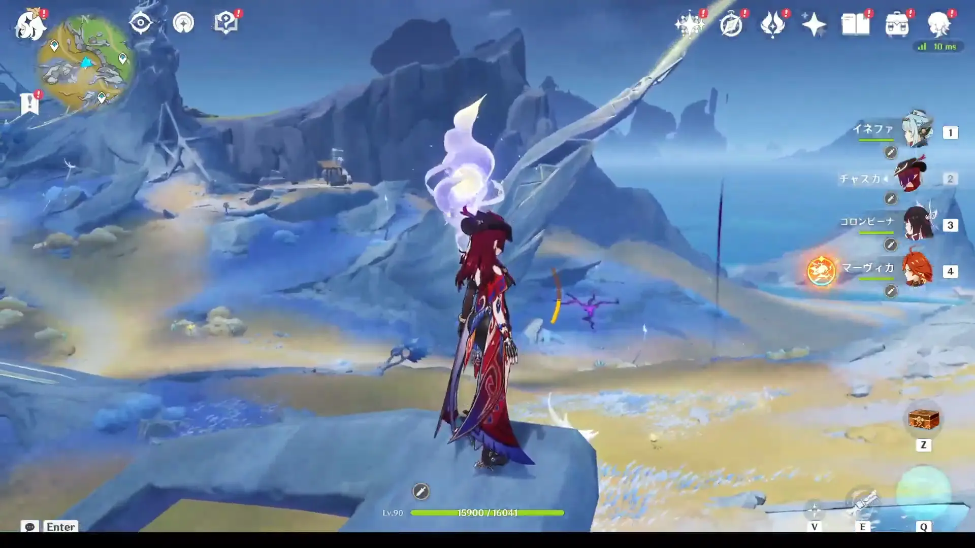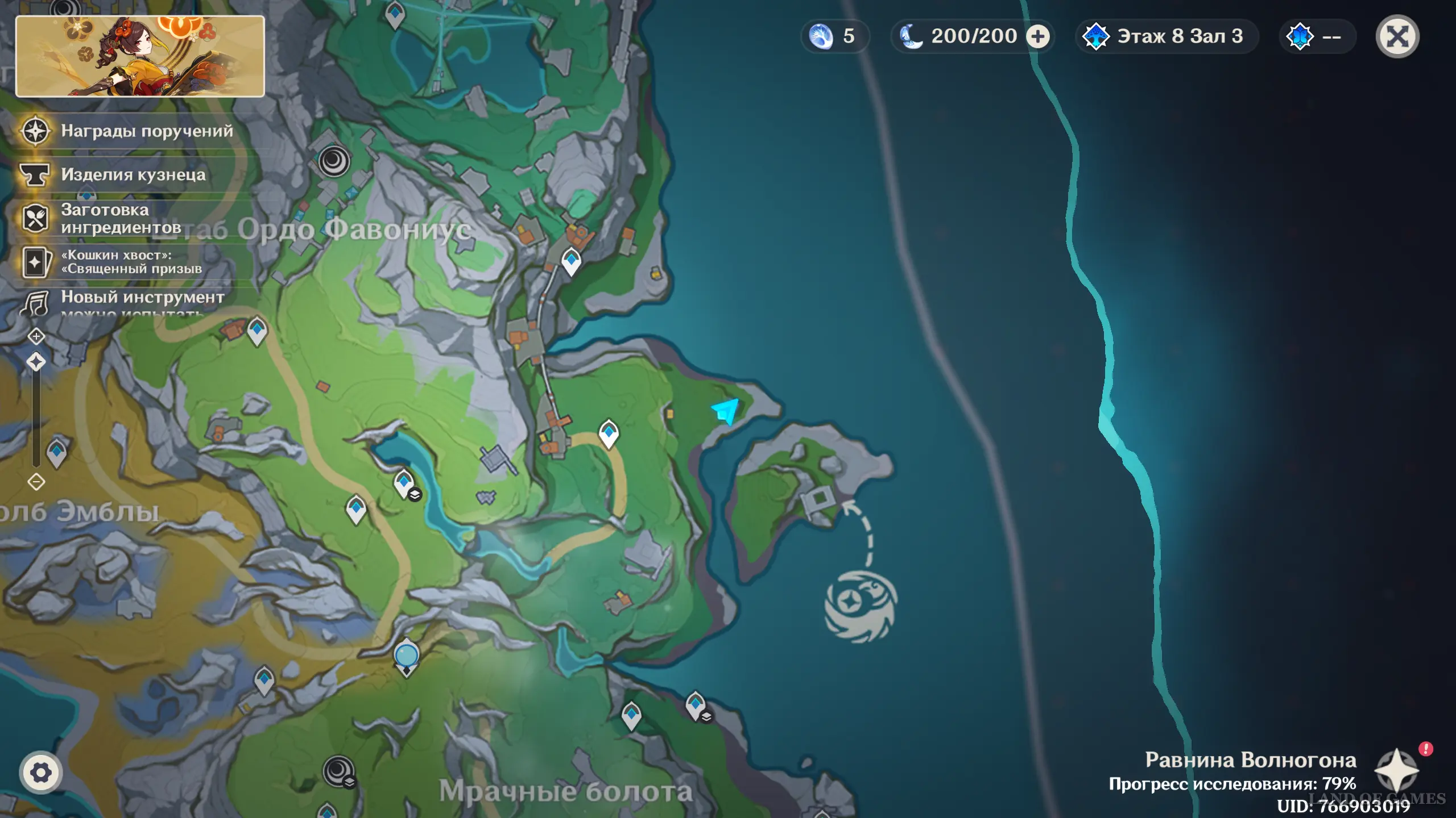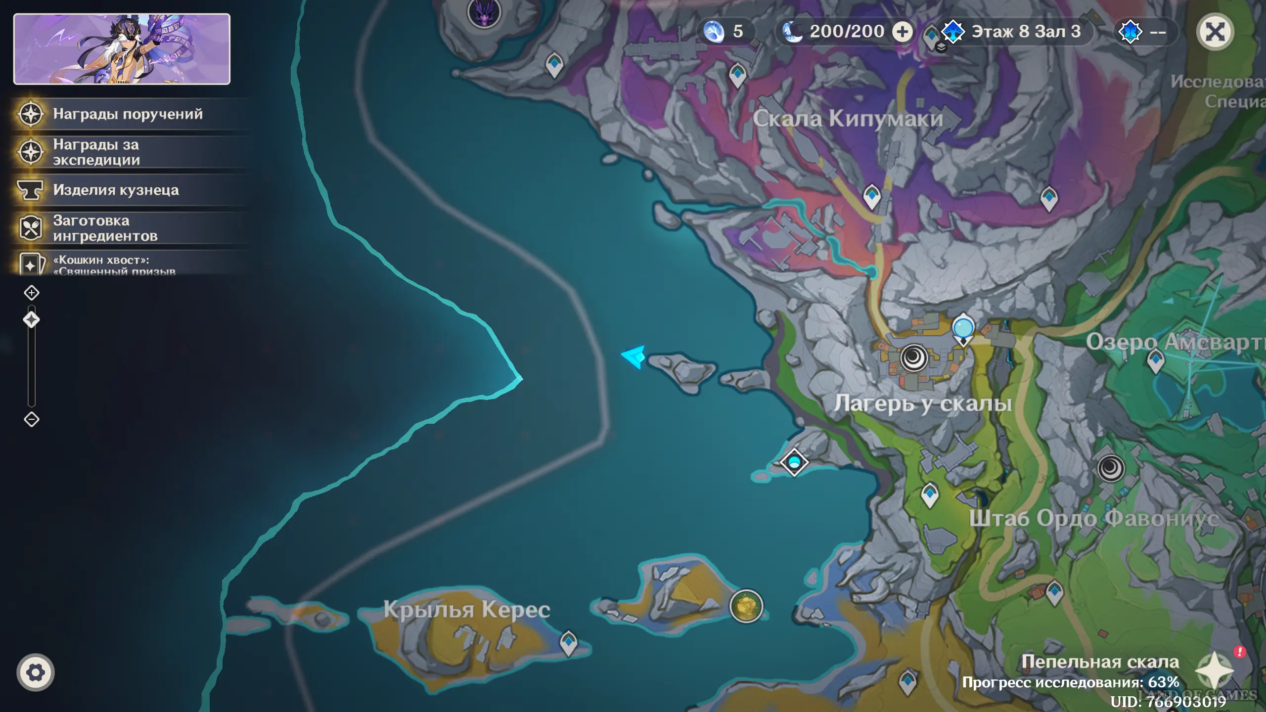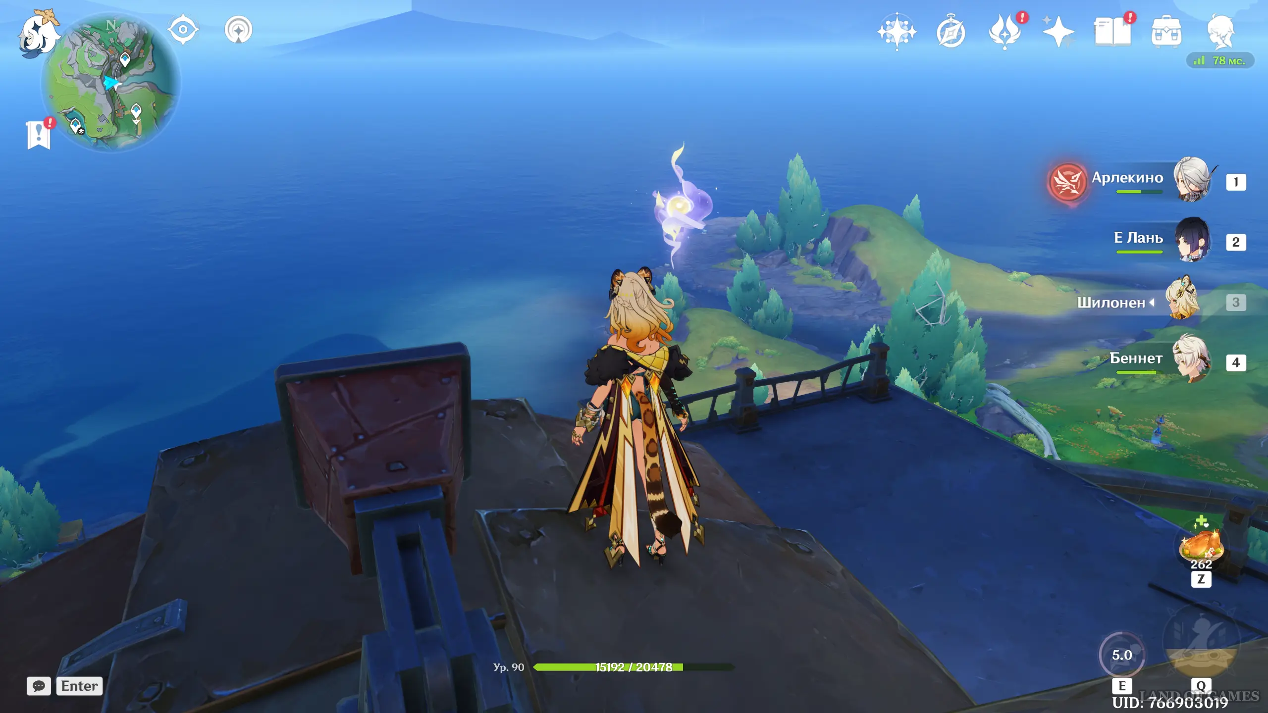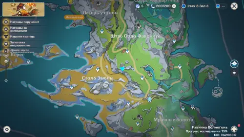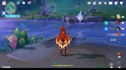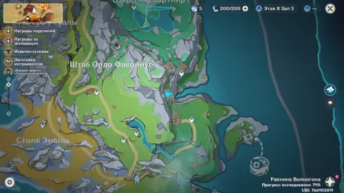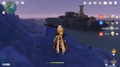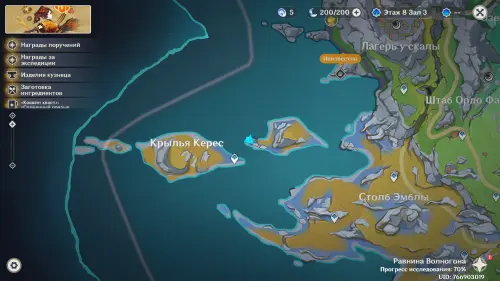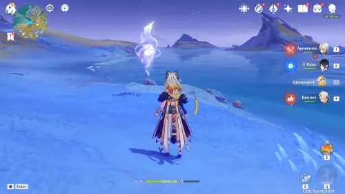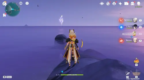 Переместитесь к самому южному телепорту локации, на пристань, а потом развернитесь и пройдите еще дальше на юг. Чуть впереди вы увидите небольшой островок, над которым парит окулус. Вы можете добраться до него вплавь или воспользоваться Кэей, замораживая перед собой воду.