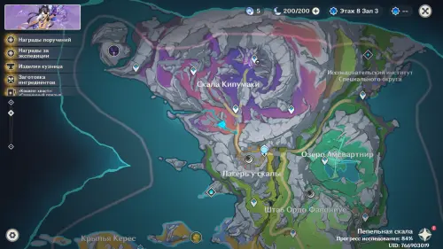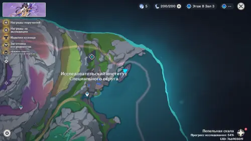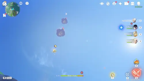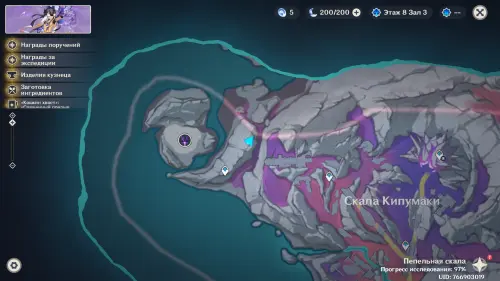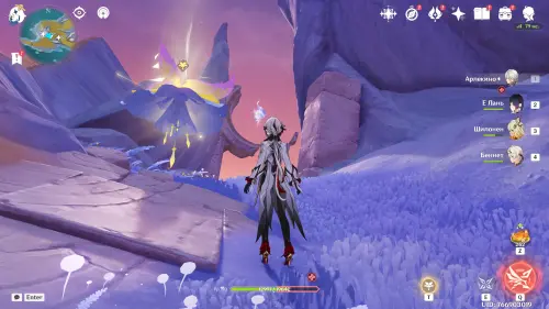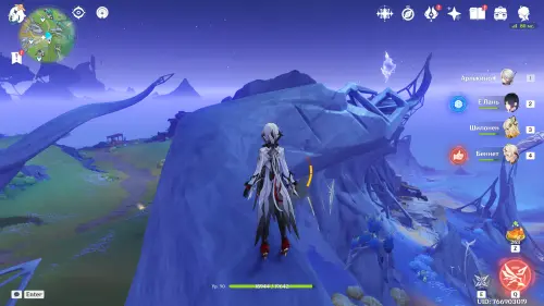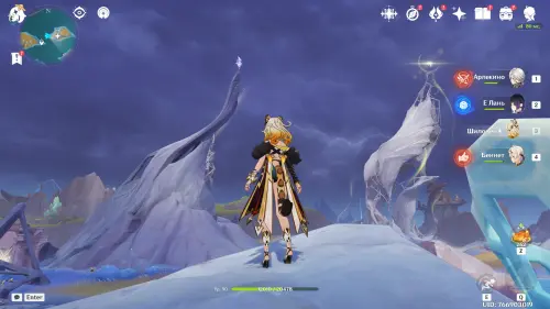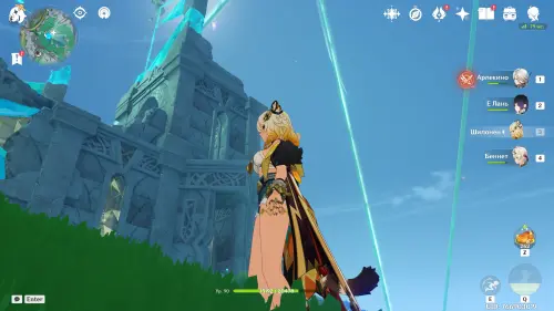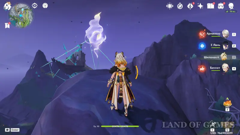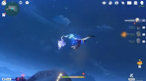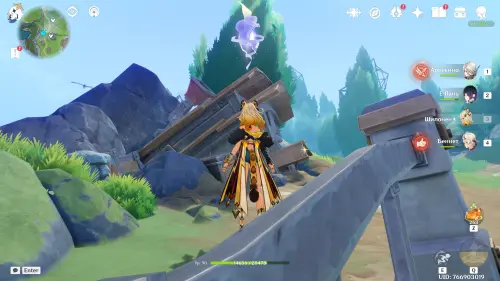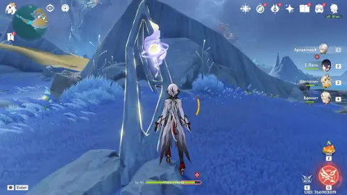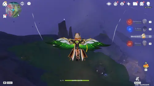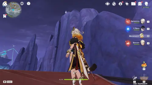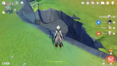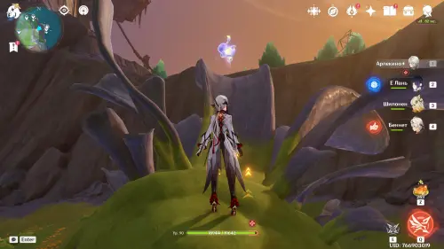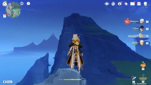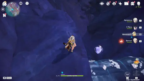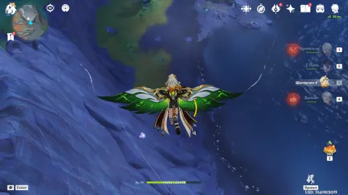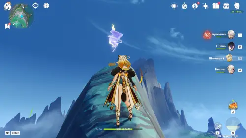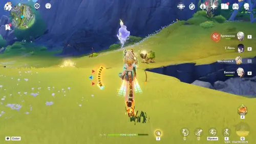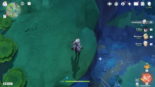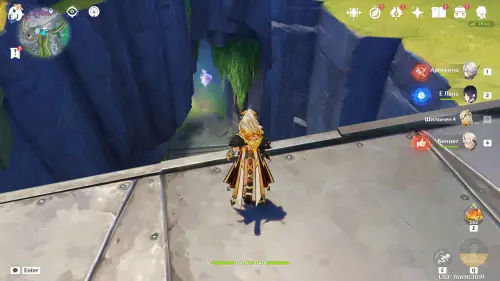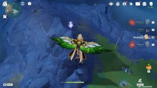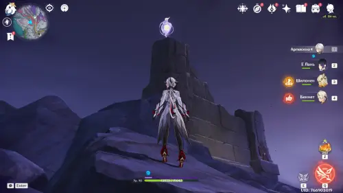 Переместитесь к северному телепорту указанной области, а затем бегите на северо-восток к краю обрыва. Впереди вы увидите скалу, на вершине которой будет парить окул. Спланируйте на нее и схватите частицу, поставив Гео конструкцию Путешественника. Если все равно не получается достать лунокул, то спуститесь немного вниз, превратитесь в куухенки и воспользуйтесь разноцветными воздушными массами, чтобы запульнуть себя вверх.