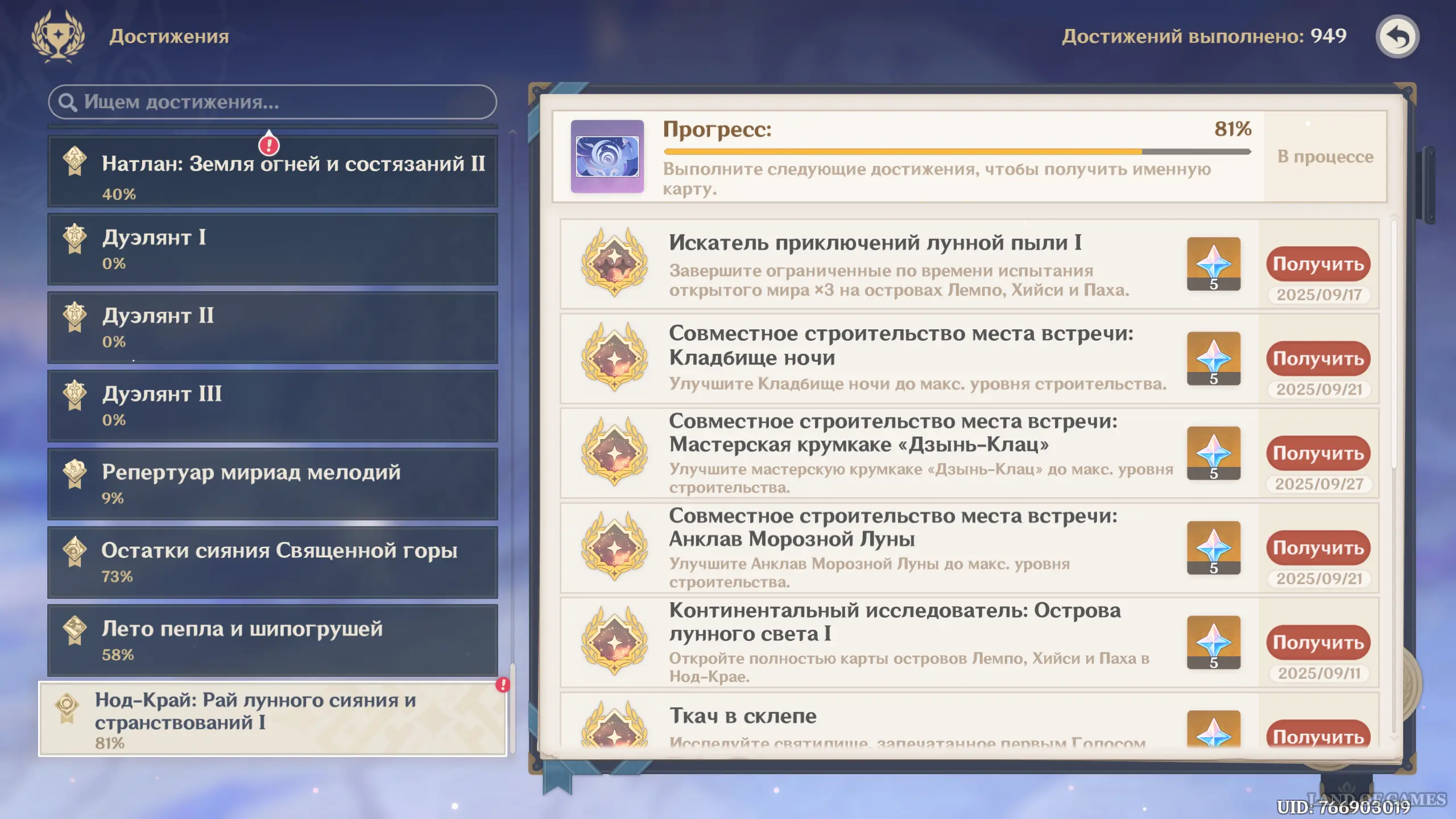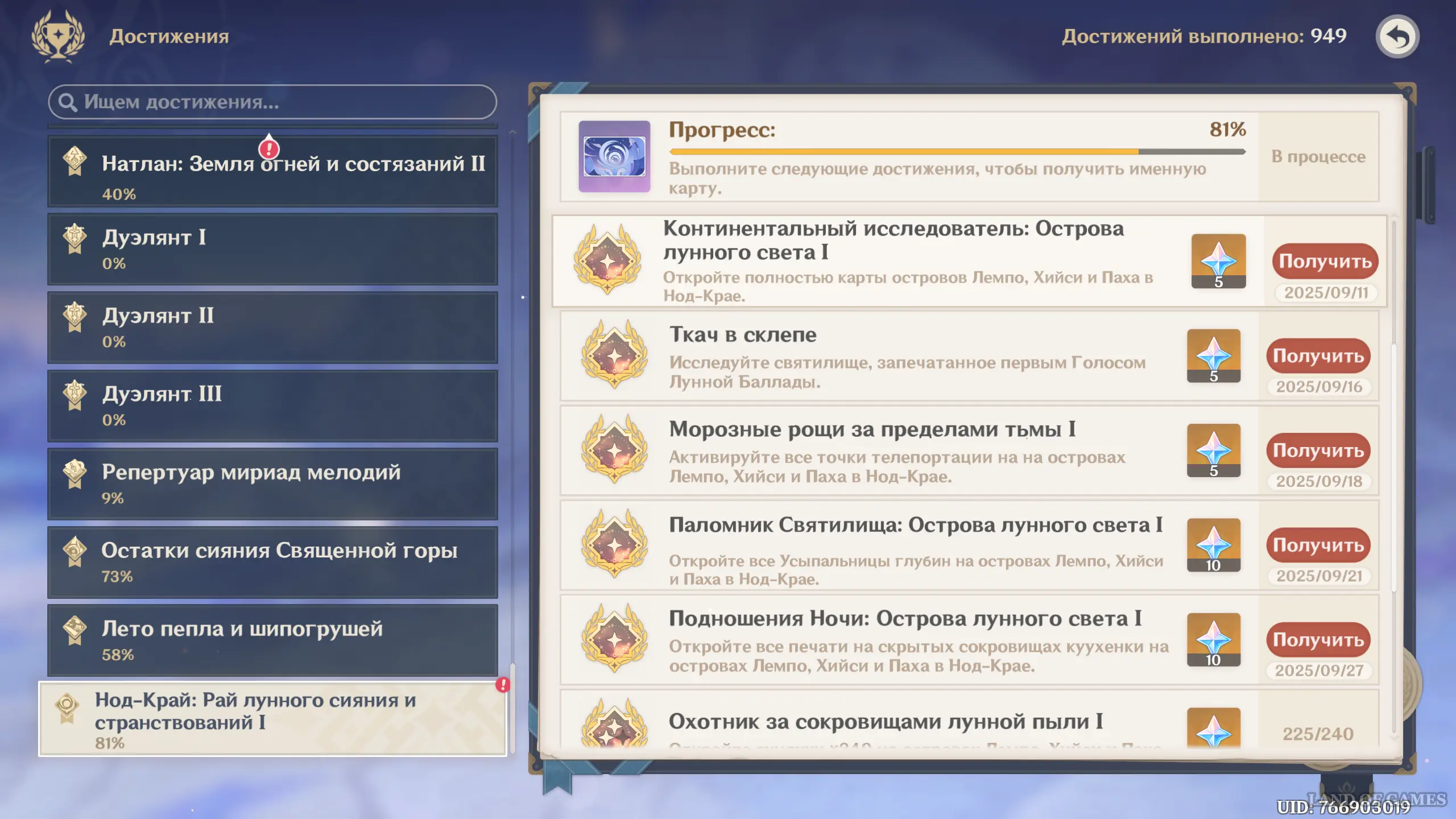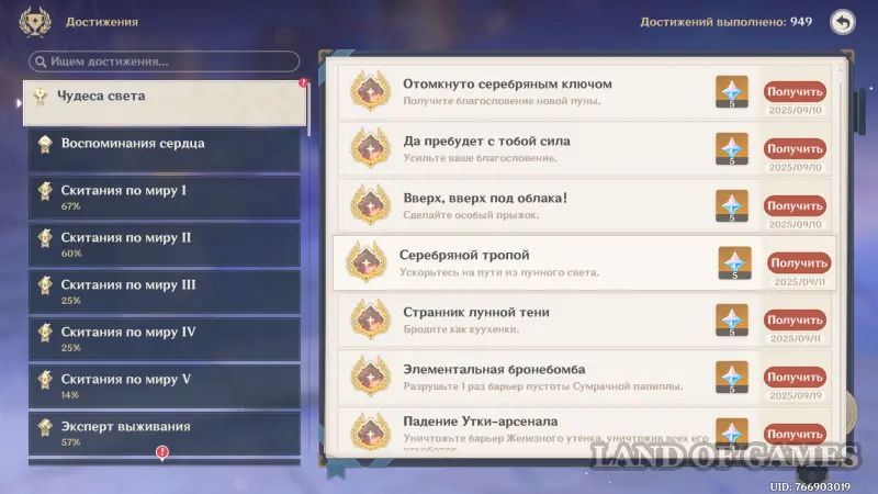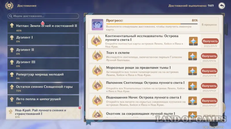 В указанной версии можно открыть 51 секретный и обычный трофеи, и все они относятся к трем категориям: «Чудеса света», «Нод-Край: Рай лунного сияния и странствований I» и «Встреча в другом мире VI». Открыв их, вы сможете заработать 380 камней истока.