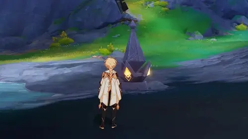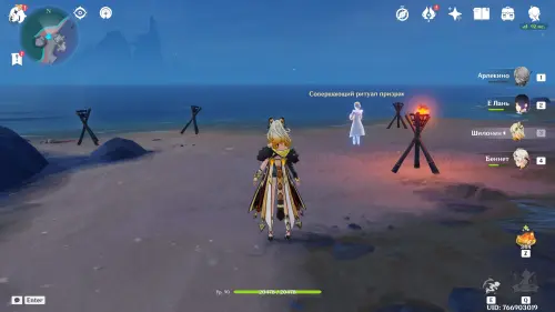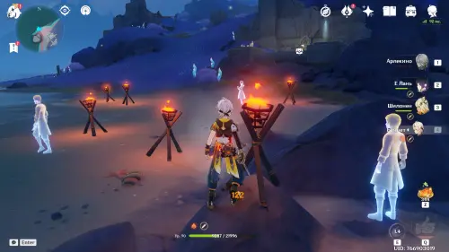 Переместитесь к месту встречи на Кладбище ночи, перед этим обязательно открыв его, выполнив задание «К маяку», а затем пройдите к морскому побережью на северо-западе локации. Здесь вы обнаружите 6 жаровен. Возьмите любого Пиро персонажа (подойдет и бесплатная Эмбер), а затем зажгите все факелы в любом порядке. Как только вы это сделаете, неподалеку тут же возникнет богатый сундук.