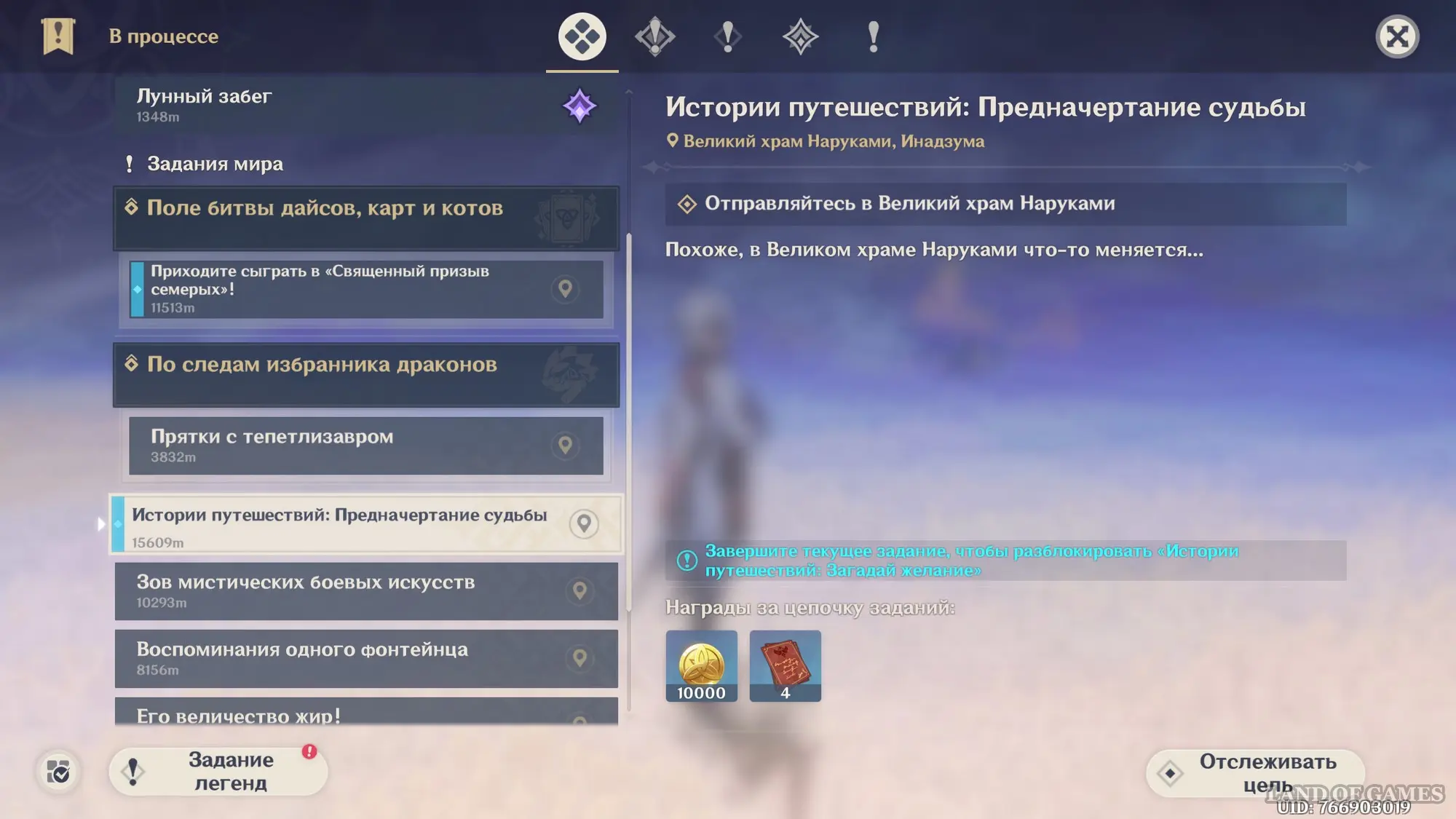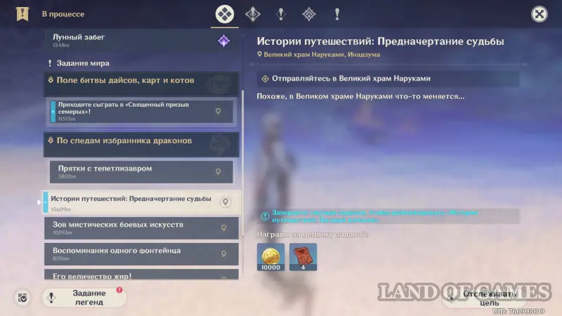 Отметим, что вы можете повысить шанс на встречу того или иного персонажа в открытом мире. Для этого вам нужно будет выполнить небольшой побочный квест «Истории путешествий: Предначертание судьбы». Переместитесь в Великий храм Наруками, расположенный в Инадзуме, а затем подойдите к Яэ Мико.