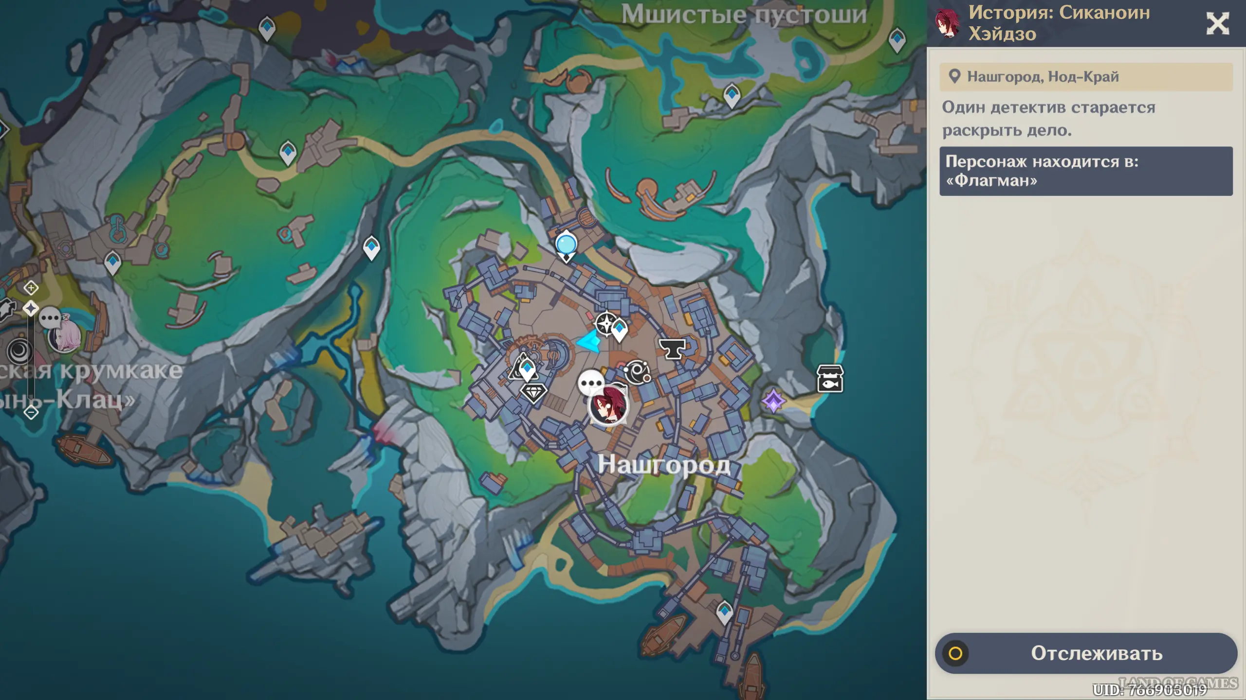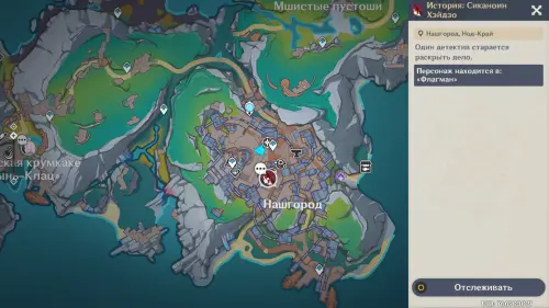 Отыскать инадзумского детектива можно в баре «Флагман» в Нашгороде. Подойдите к барной стойке, и вы увидите старого знакомого, ведущего переговоры с Ягодой. Вы узнаете, что Хэйдзо решил заручиться поддержкой Куратория тайн для поимки бандита, сбежавшего из Инадзумы и присоединившегося к банде «Морские крюки» в Нод-Крае. Однако Ягода сообщит, что нынешняя банда является лишь подражателями настоящих «Морских крюков», которые давным-давно распались. Судя по тону девушки, она была хороша осведомлена о деятельности этой группировки. Возможно, даже состояла в ней в прошлом.