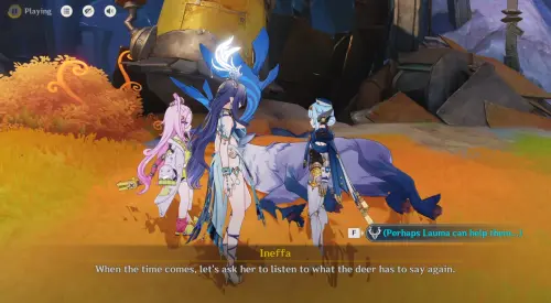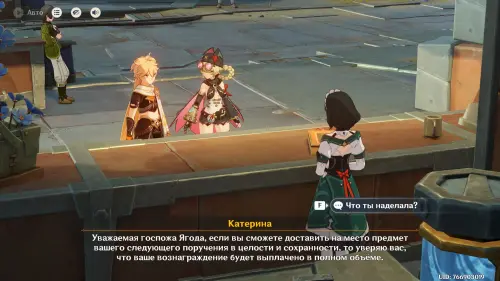 Переместитесь к южному телепорту Нашгорода, и вы обнаружите здесь Е Лань, стоящую рядом с Цай Жо. Вы узнаете, что они готовят поставки растений и руды с куувяки в Ли Юэ, чтобы там их смогли внимательно изучить. Вместе с грузом также были отправлены снимки Фатуи, поэтому важна секретность. Плюс, она расскажет вам о своих взаимодействиях с Нефер.