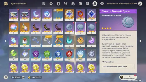 Итак, если вы обнаружили 3 печати вечной луны определенного типа, то теперь сможете с помощью них убрать конкретный барьер, ведущий в сокровищницу. На каждом острове можно обнаружить одно подобное место. Чтобы обнаружить его, откройте инвентарь, перейдите в раздел «Драгоценности» и найдите в нем три собранные реликвии, а затем нажмите на кнопку «В сокровищницу».