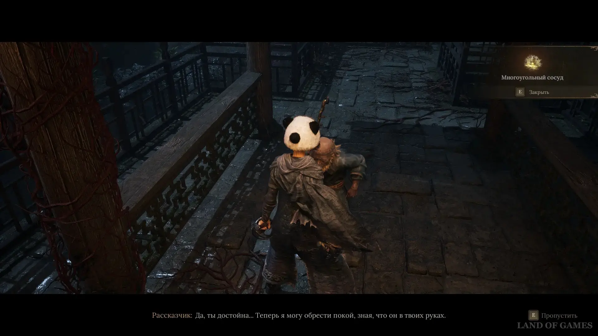 Попав в Разрушенную небесную деревню, найдите Рассказчика посреди двора Анналюма. Он попросит вас помочь в бою с Ведьмой. Чтобы получить нужную концовку, откажитесь от его просьбы.