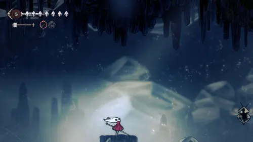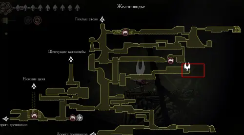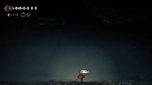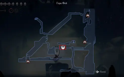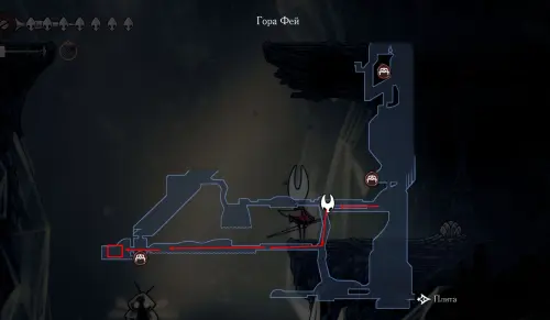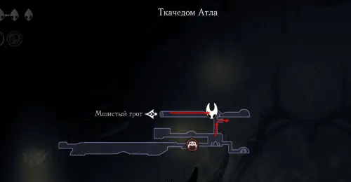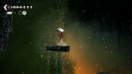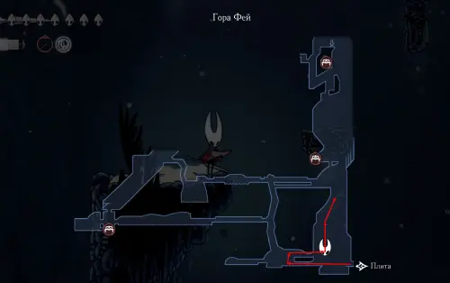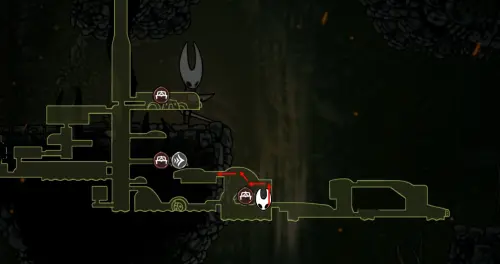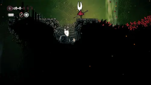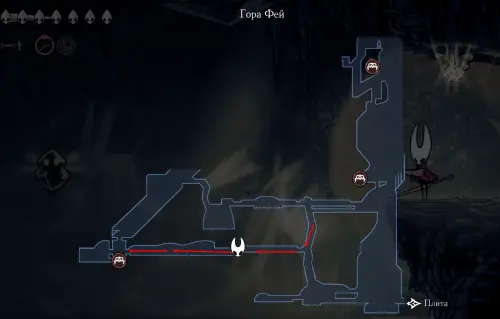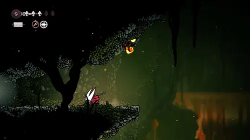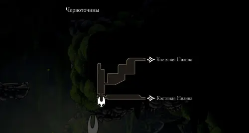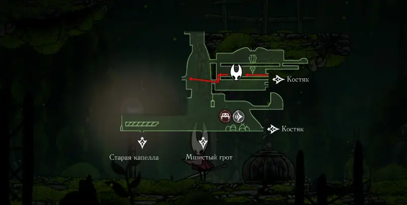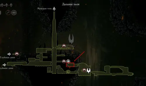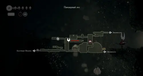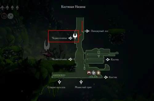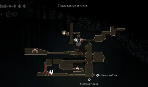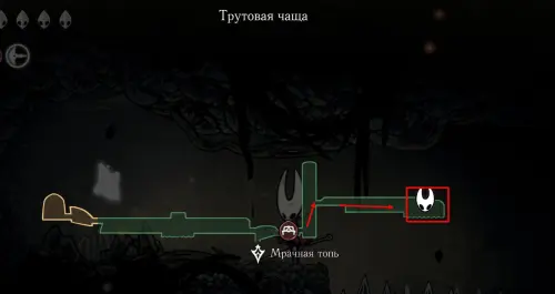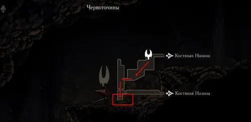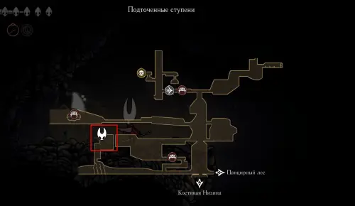 При спуске легко миновать всех противников, просто летим вниз. Главное здесь не провалиться в проход, ведущий на локацию ниже. Также мы окажемся на этом месте, когда впервые попадем на «Подточенных ступенях», придя сюда с «Панцирного леса». Правда на тот момент у вас вряд ли будут нужные навыки, поэтому за маской придется вернуться позже через станцию сверху.