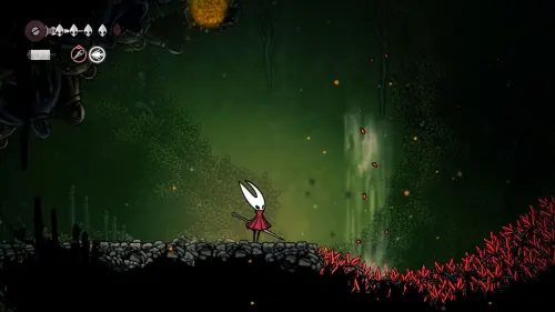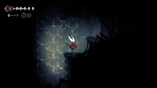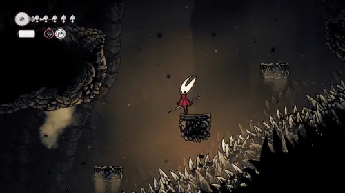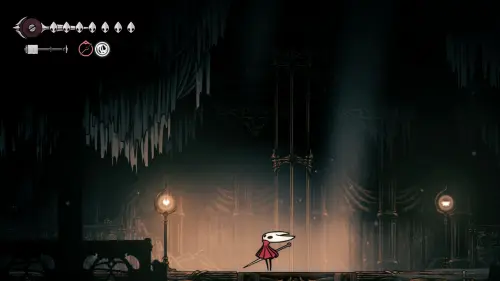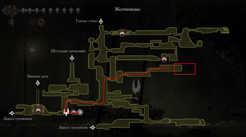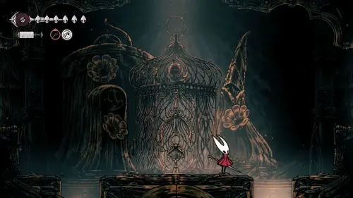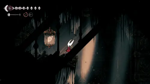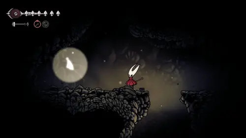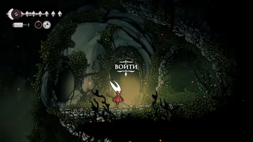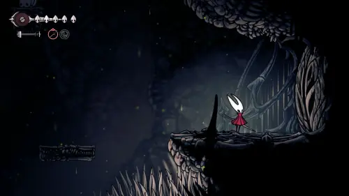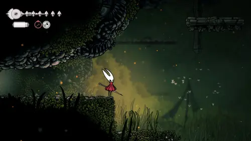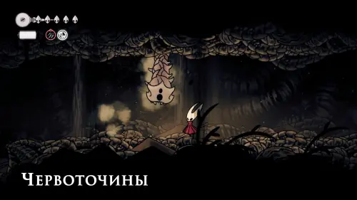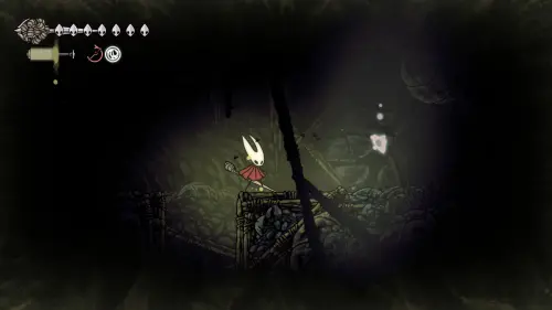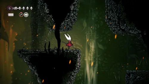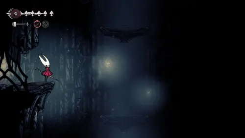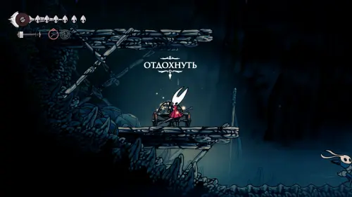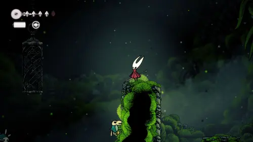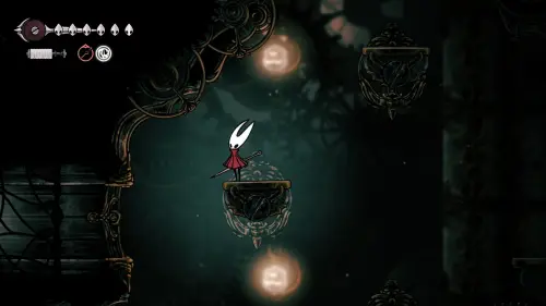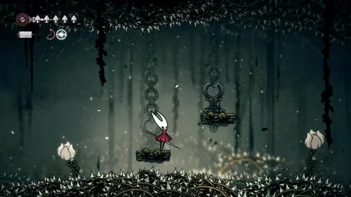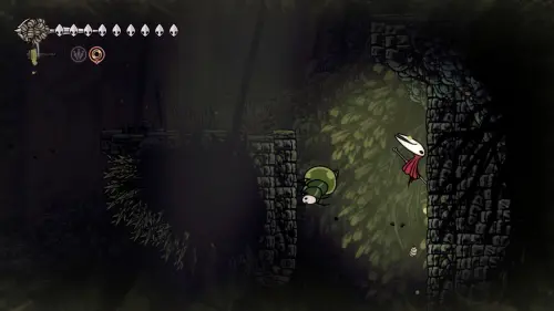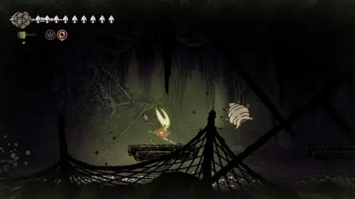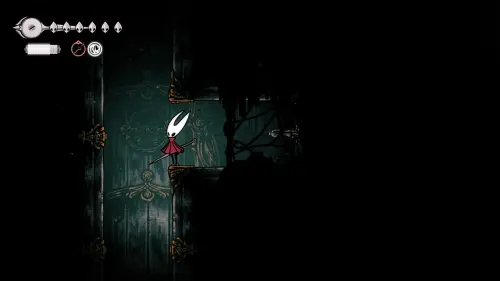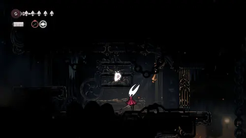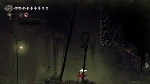 Дойти до самого конца не получится. Игра не даст это сделать и развернет Хорнет назад. Нас интересует именно проход наверх. Попасть туда довольно сложно, придется сочетать сразу несколько навыков — двойной прыжок, рывок и крюк-кошку. Запрыгиваем на первую платформу сверху.