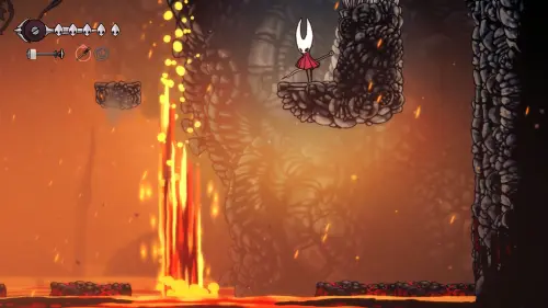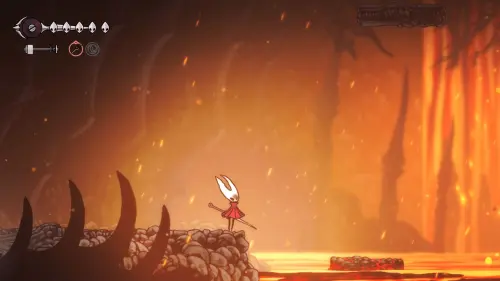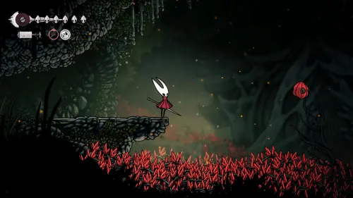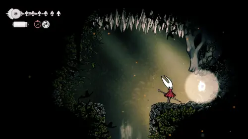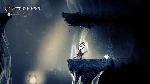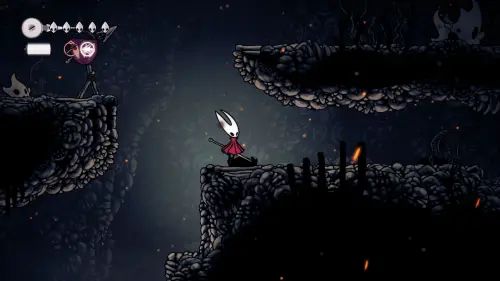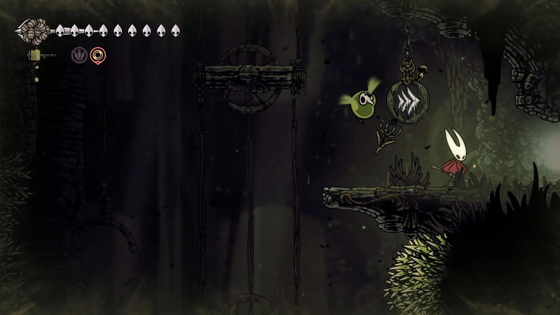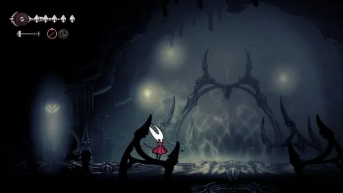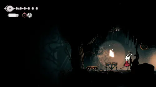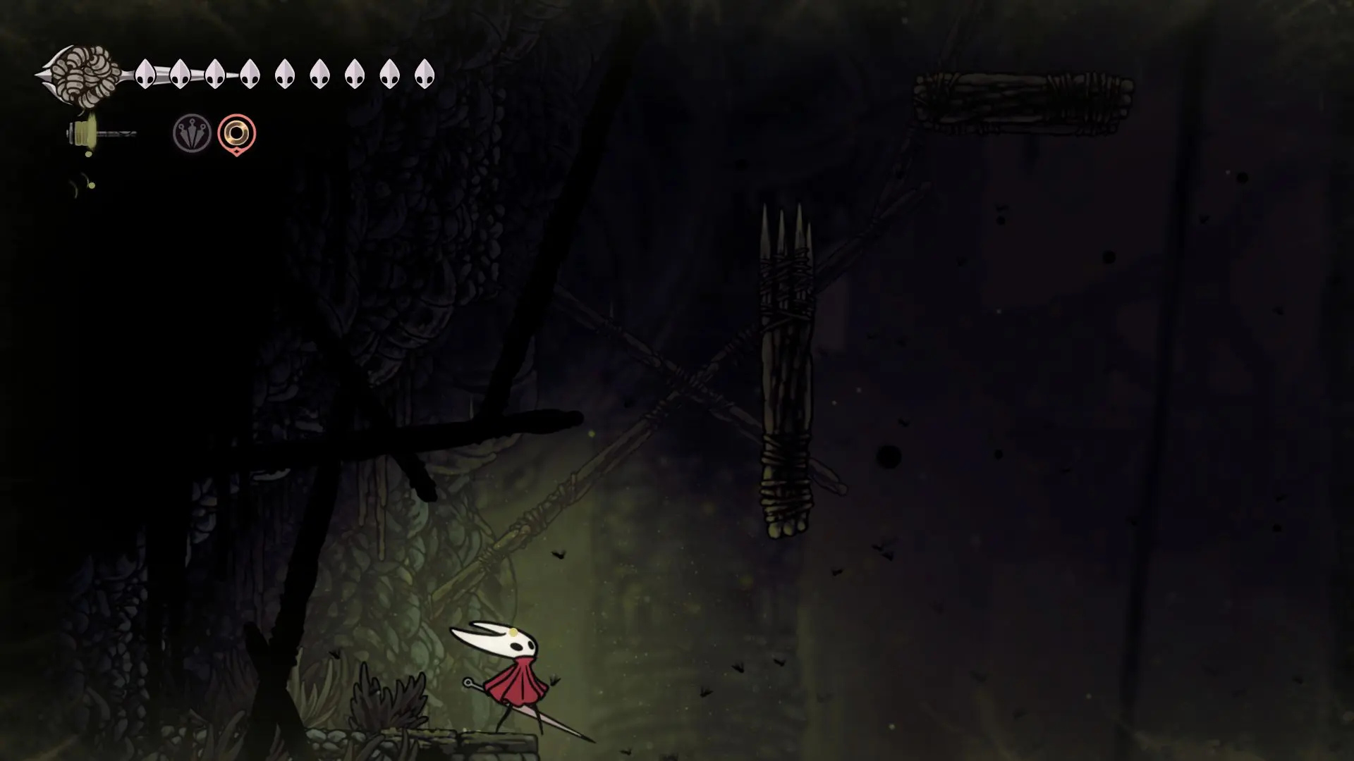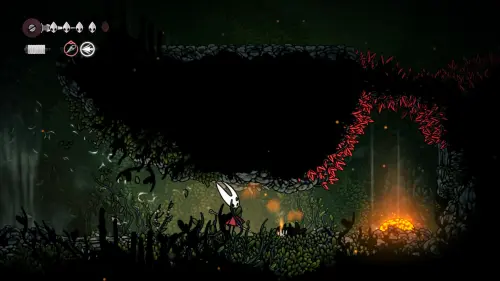 Дойти до самого конца не получится. Игра не даст это сделать и развернет Хорнет назад. Нас интересует именно проход наверх. Попасть туда довольно сложно, придется сочетать сразу несколько навыков — двойной прыжок, рывок и крюк-кошку. Запрыгиваем на первую платформу сверху.
