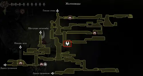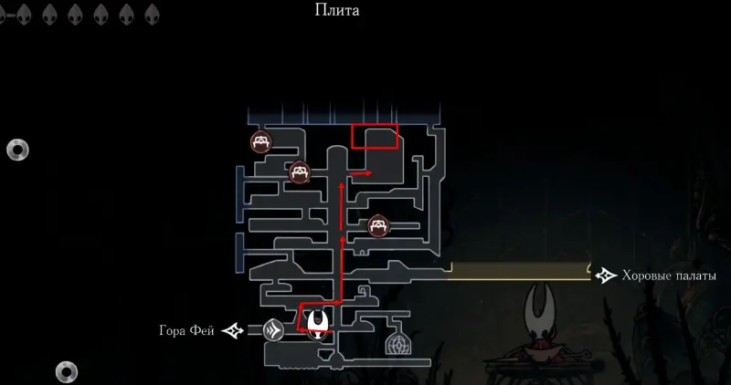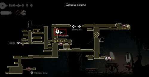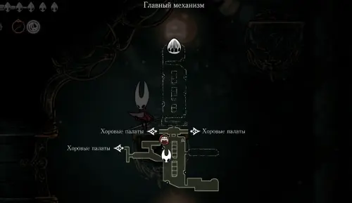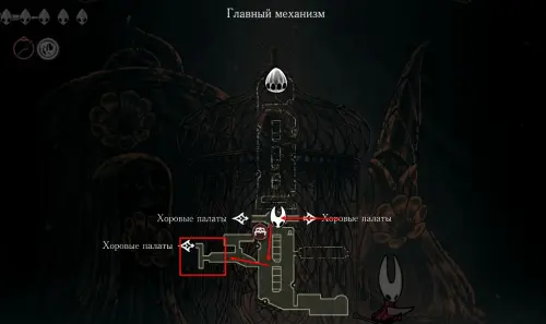 Этот путь самый быстрый и доступен только при условии, что вы убили босса Троббио. Если же проход заблокирован, то попасть на эту локацию можно через круглый механизм в «Хоровых палатах». В таком случае ваш путь будет выглядеть следующим образом.