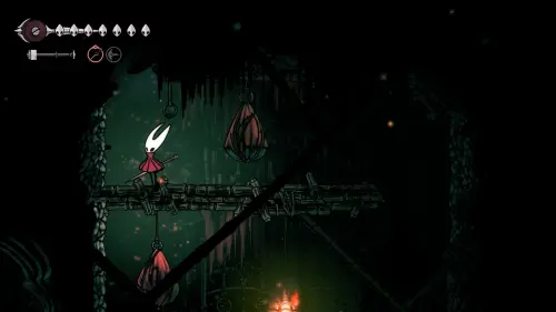 С этой платформы используем крюк-кошку и прыгаем в пещеру снизу — находится прямо между двух бубенцов. Так окажемся в скрытой норе. Продолжаем движение в левую часть, осторожно спускаясь вниз.