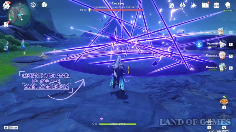 Удар демоноборца — это самая масштабная атака 1-й фазы, очень похожая на ульту Кэ Цин: враг заряжает удар по площади, в радиусе которого появится подобие купола, испещренное электро разрезами.