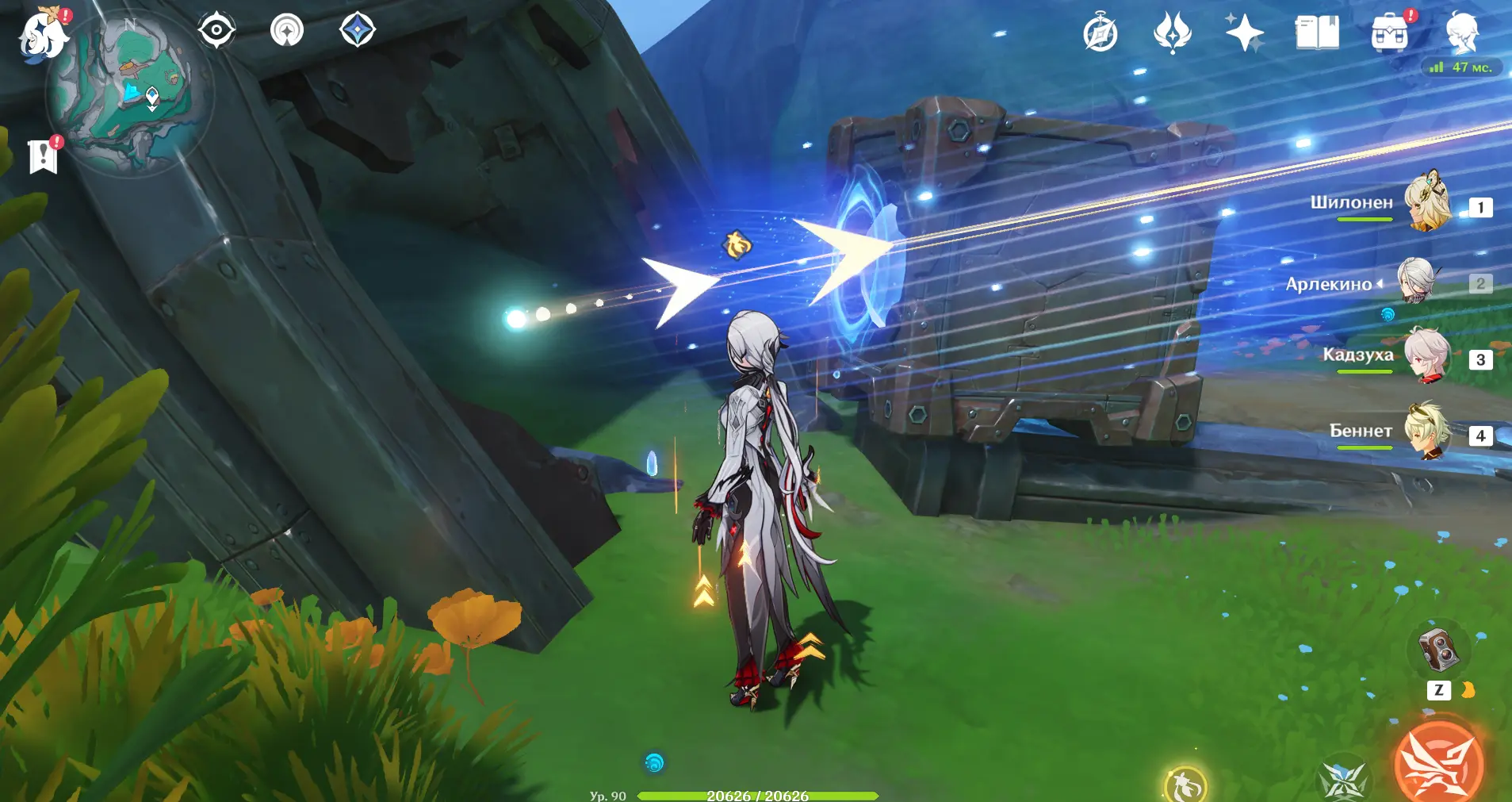 Развернитесь и пройдите обратно по направлению к точке телепортации. Недалеко от нее находятся устройство и маленький робот. Подойдите к роботу и активируйте его, чтобы он начал идти за вами. Потом идите к устройству и встаньте так, чтобы робот оказался между двумя его частями. Дважды нажмите «вращать». Половина устройства сдвинется, открыв проход в маленькую нишу позади него. Загляните туда и освободите первого лунного духа, затем проследуйте по лунному пути. Первый сундук открыт.