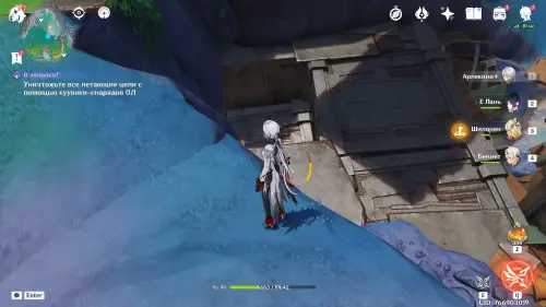 Снова переместитесь к телепорту на выступе, а затем поверните камеру вправо, и вы увидите вдалеке летающий дрон, держащий бота. Встаньте возле другого бота на краю обрыва, схватите каплю росы куувяки рядом и запустите ее в дрона, чтобы взорвать его.