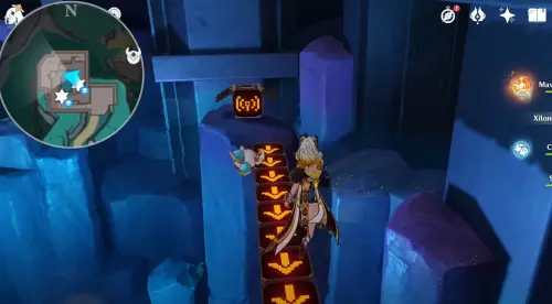 Переместитесь к юго-восточному телепорту указанной области, а затем спрыгните с обрыва и начните планировать в восточном направлении и приземлитесь на утесе с постройкой. Приблизьтесь к летающему дрону, удерживающему бота, а затем начните следовать за ним. Спрыгните в пропасть и воспользуйтесь лунной тропой, чтобы продолжить преследование робота.