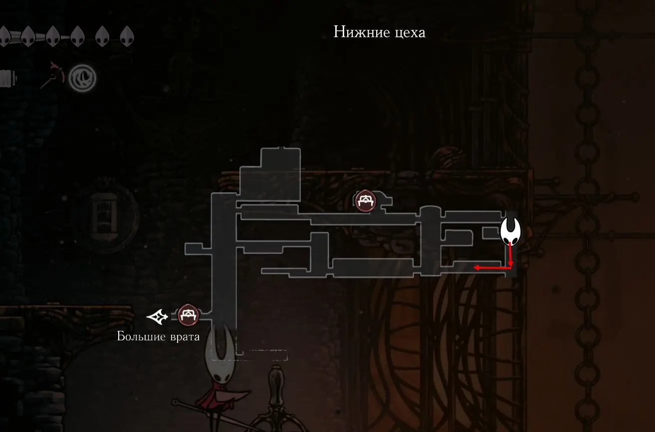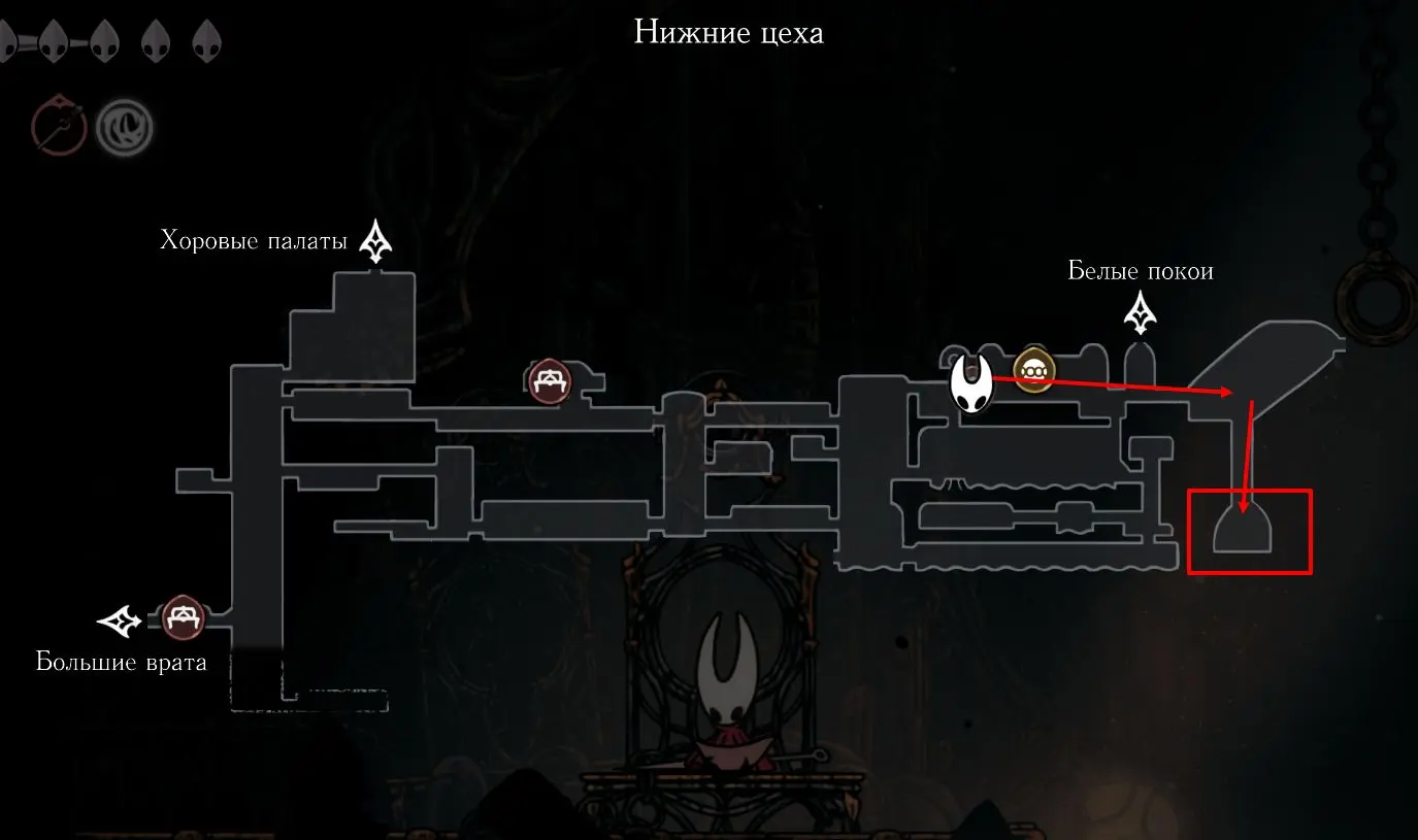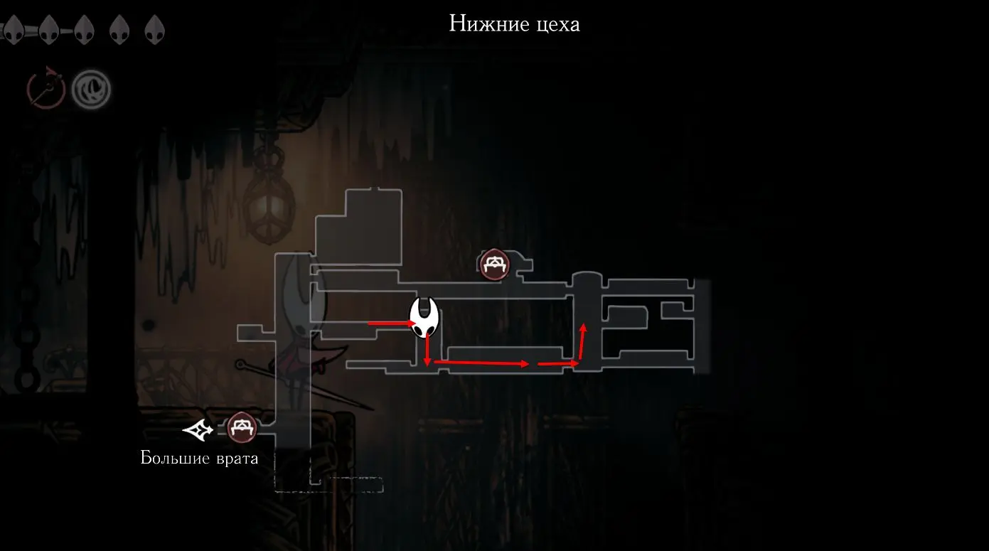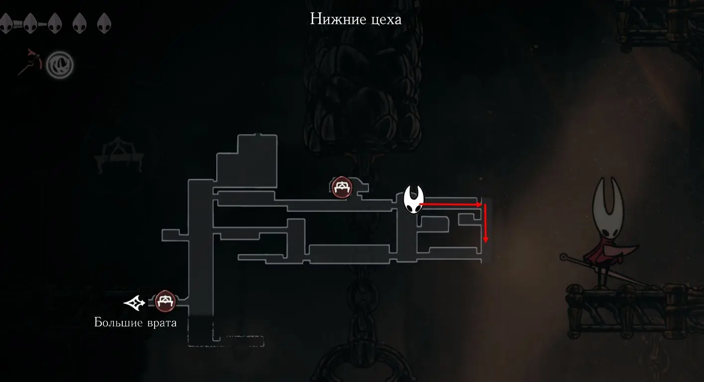 Этот осколок заберем во время второго посещения «Нижних цехов». Достаточно просто двигаться в правую часть локации от ближайшей скамейки сохранения. Так выйдем в помещение с шипами, где требуется спуститься в самый низ.