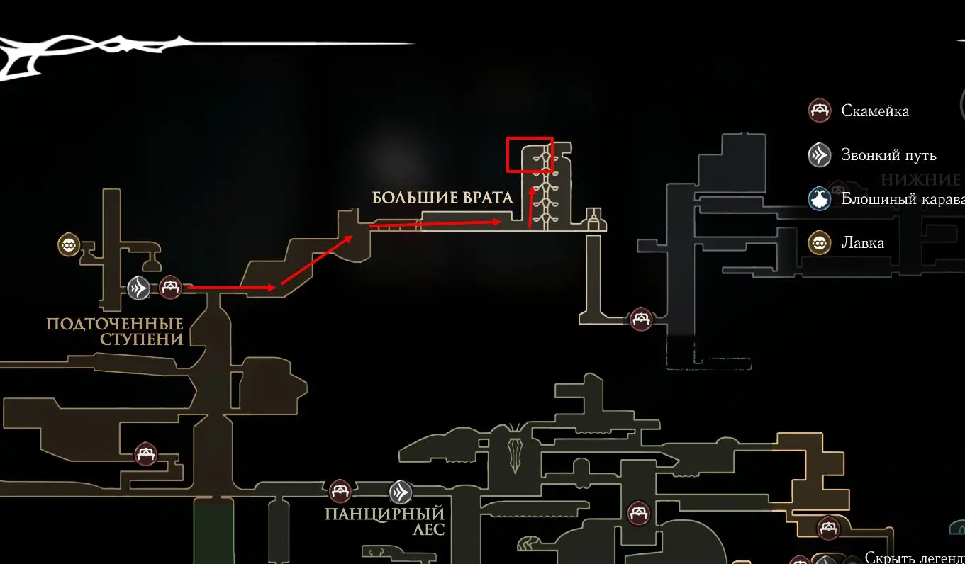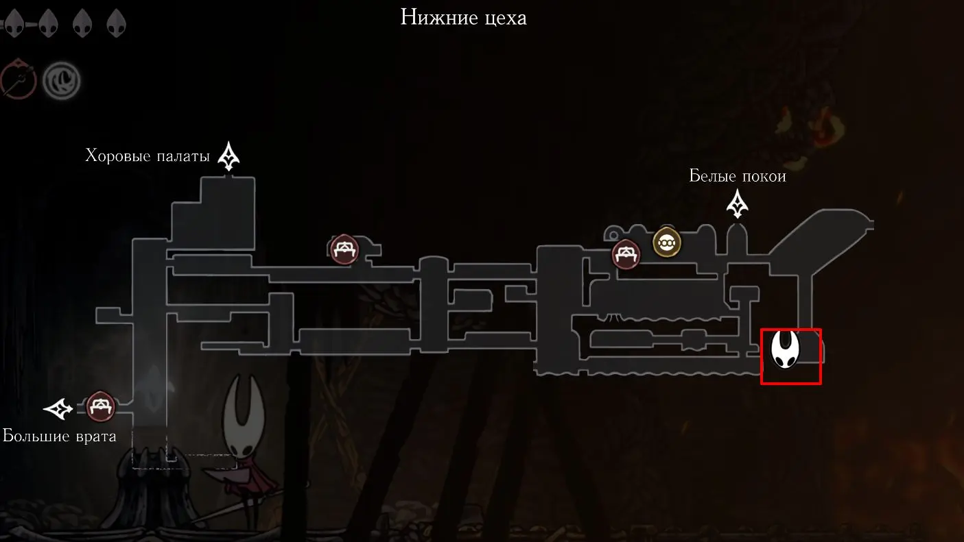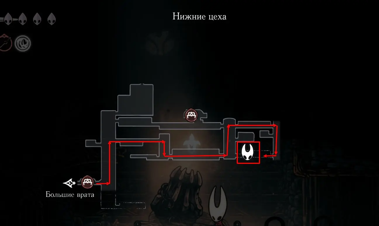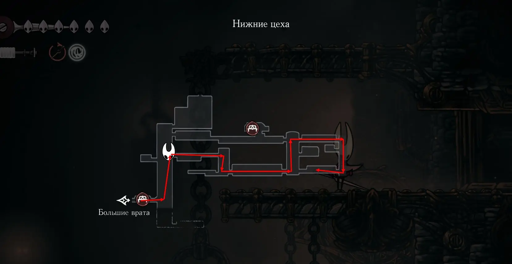 Этот осколок заберем во время второго посещения «Нижних цехов». Достаточно просто двигаться в правую часть локации от ближайшей скамейки сохранения. Так выйдем в помещение с шипами, где требуется спуститься в самый низ.