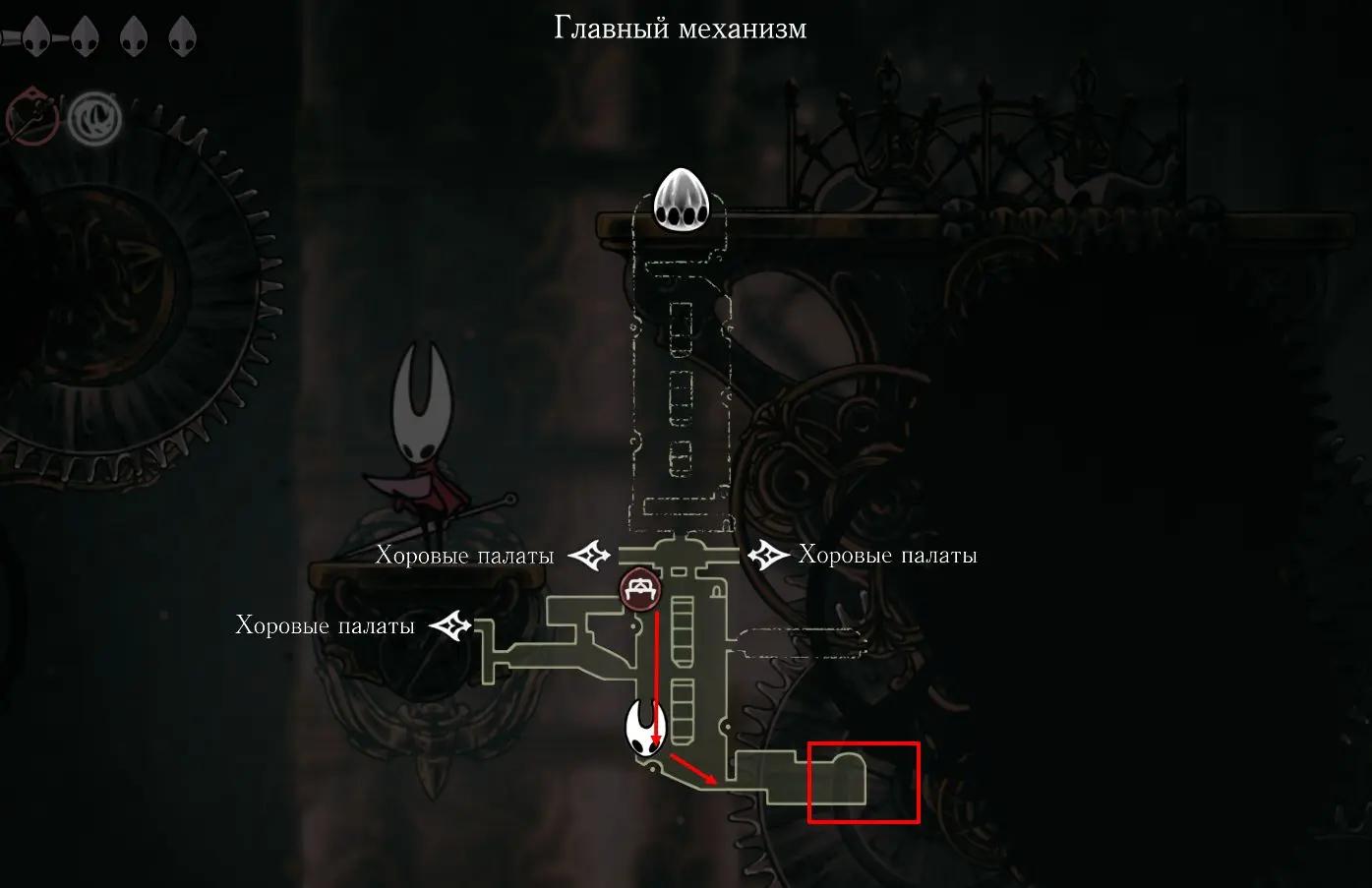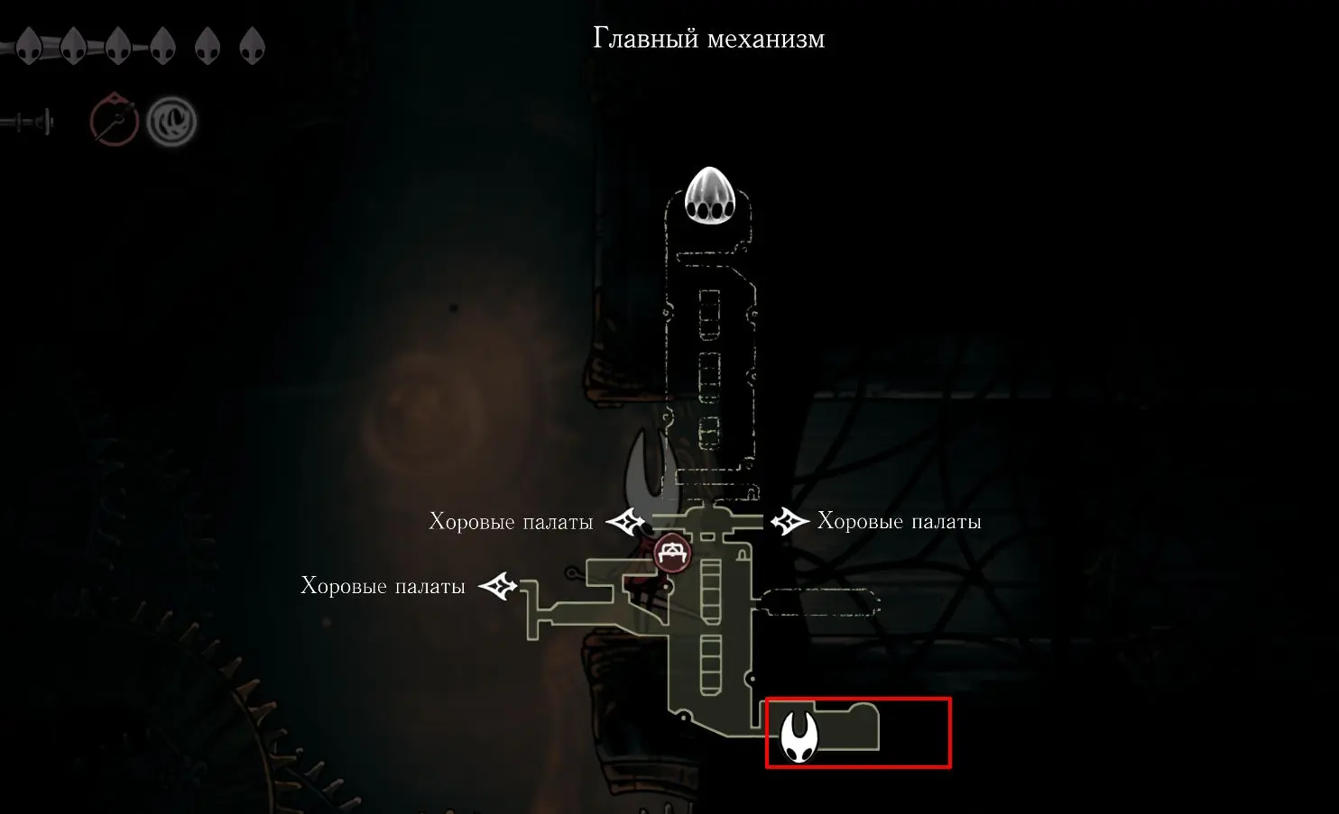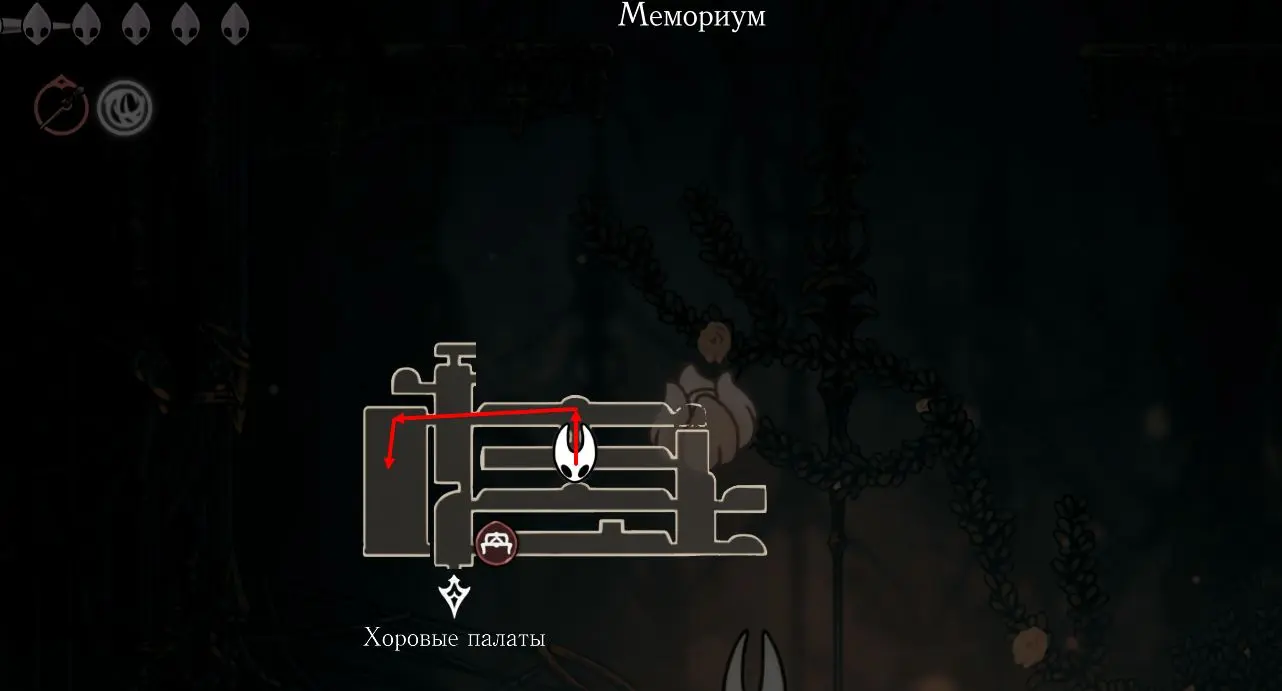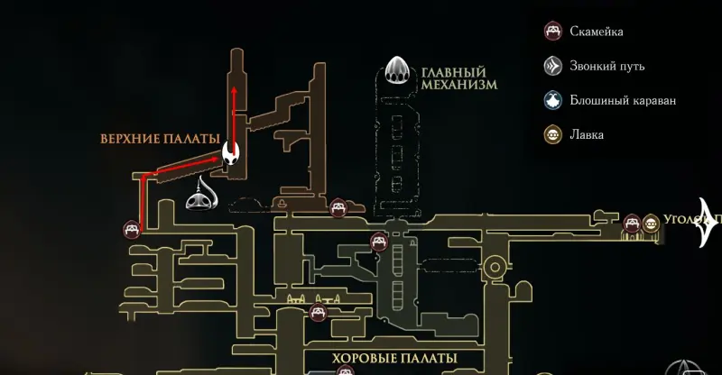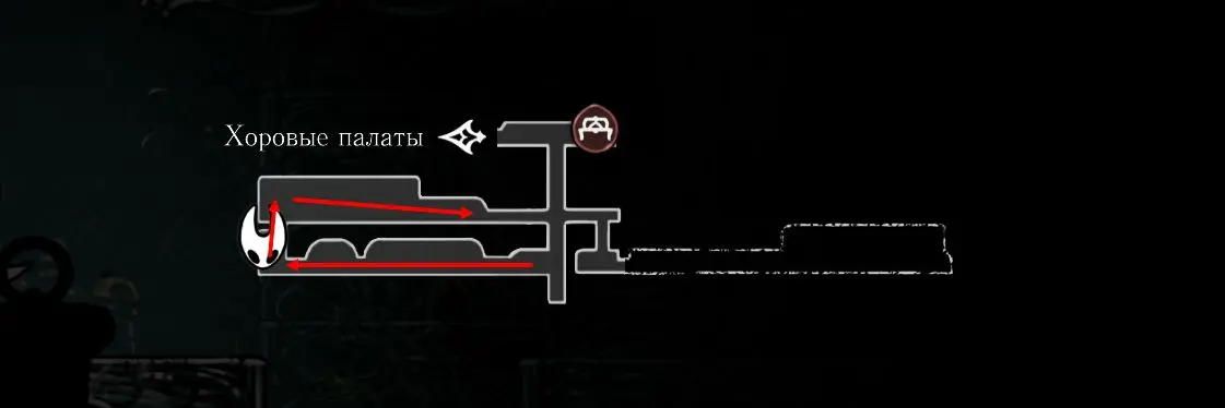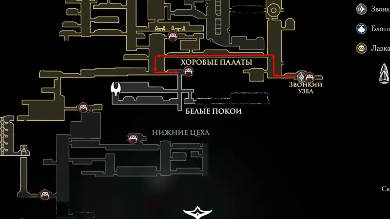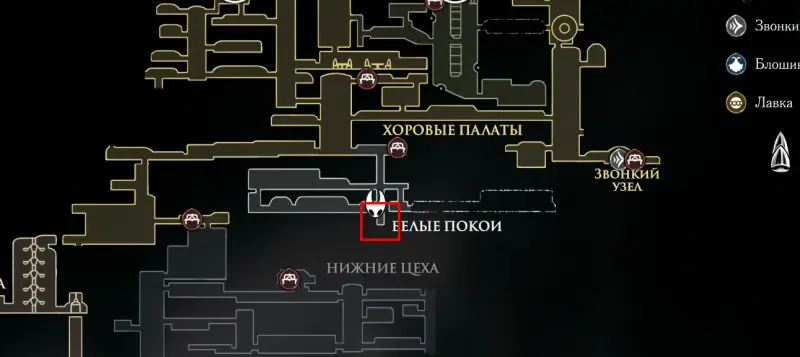 В первый раз попадем сюда с локации «Хоровые палаты». Примерно с середины локации (смотрим на карту) начинаем спускаться вниз.