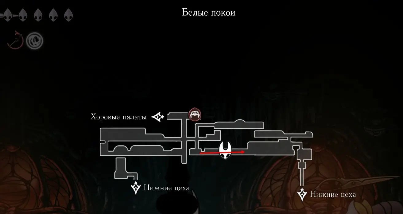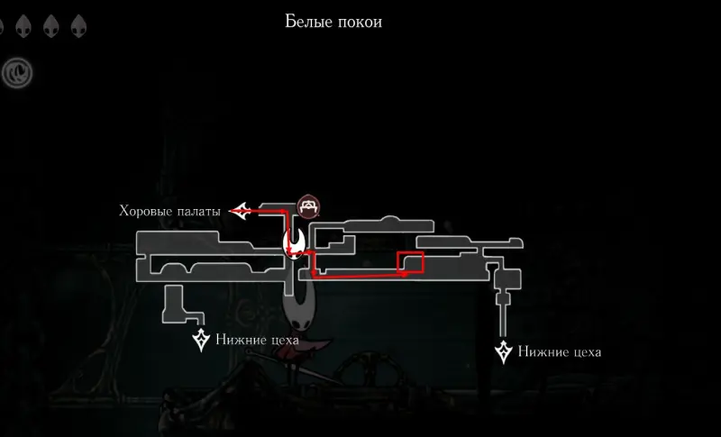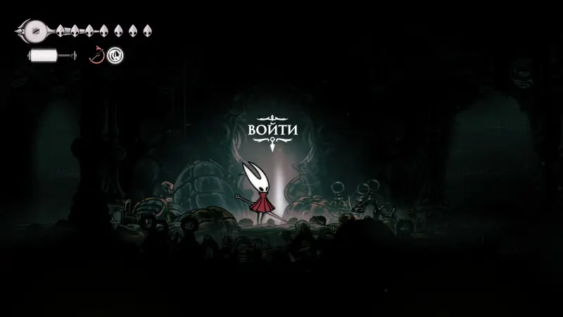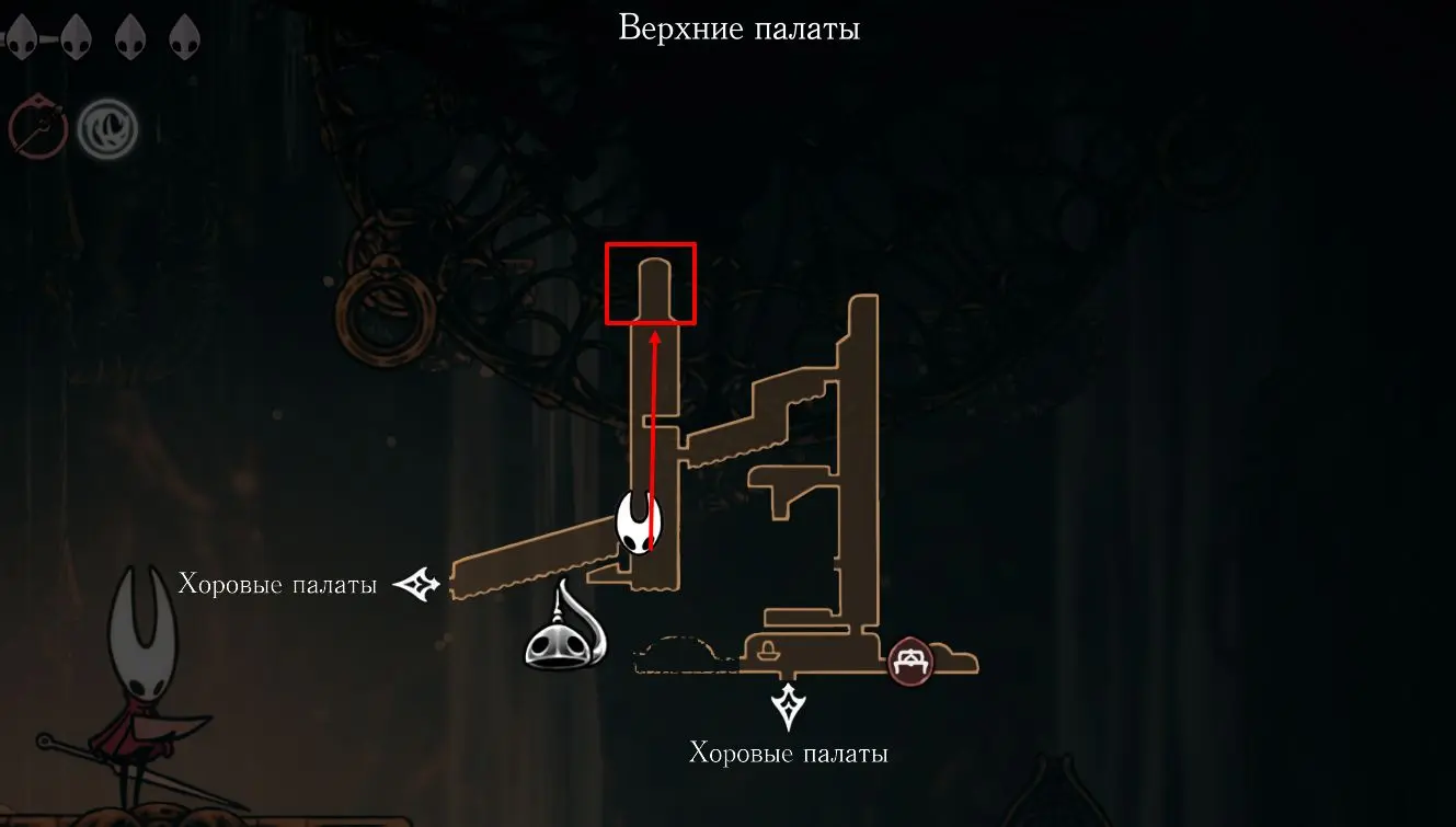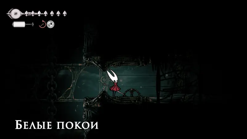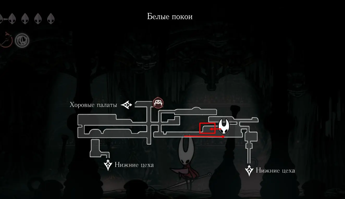 Оказавшись внизу, поднимаемся по шахте наверх, отбиваясь от мотыльков. За их убийство можем заработать немного бусин. Необходимо подняться не на самый верх (хотя, если вы тут впервые, то проход выше будет пока заблокирован).