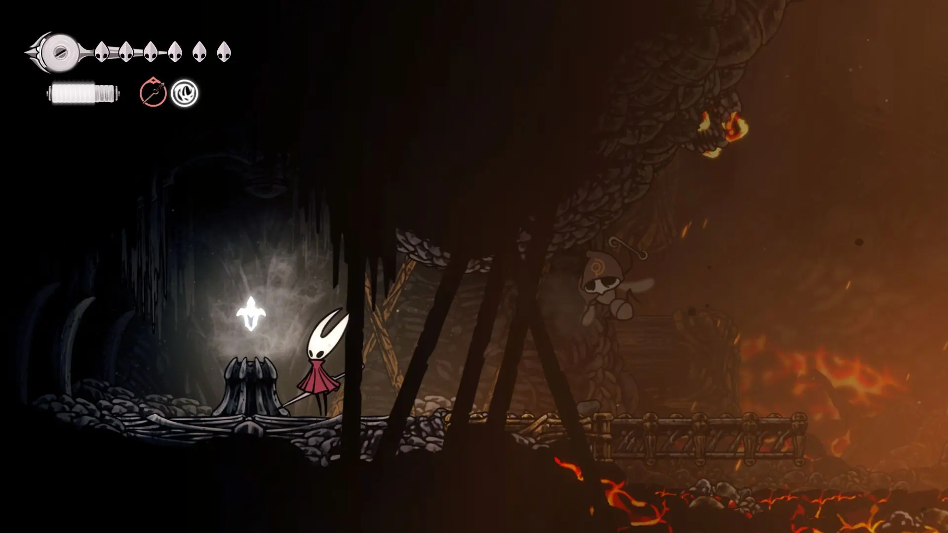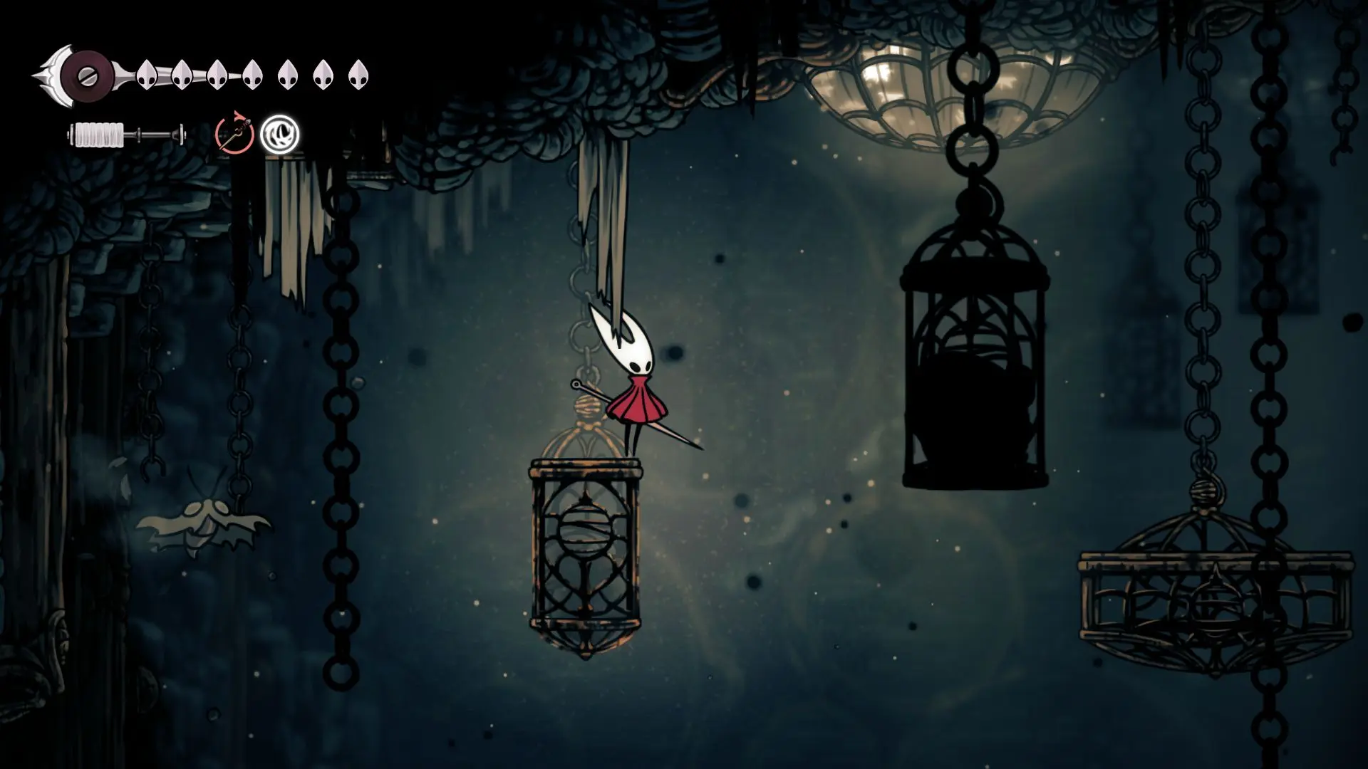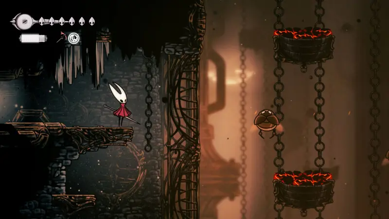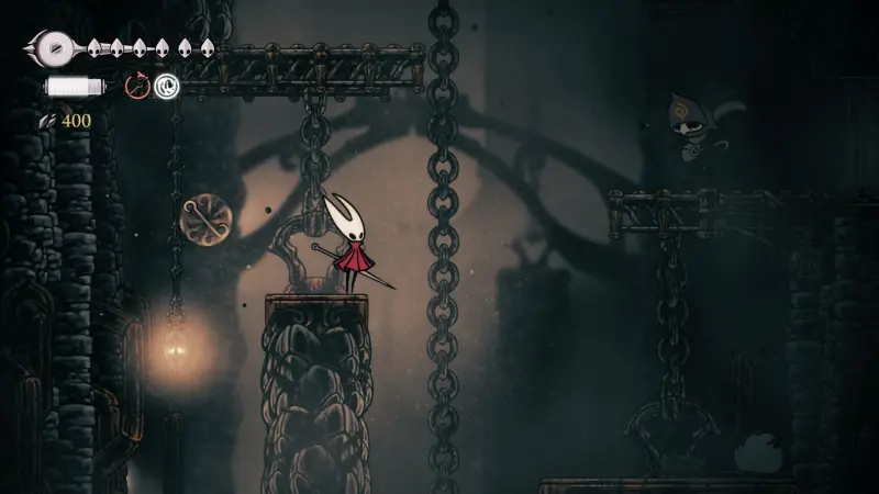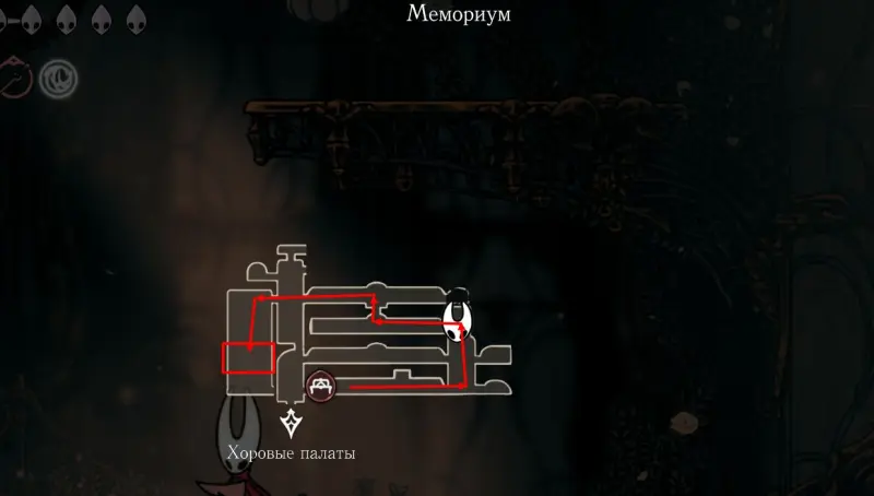Оказавшись внизу, поднимаемся по шахте наверх, отбиваясь от мотыльков. За их убийство можем заработать немного бусин. Необходимо подняться не на самый верх (хотя, если вы тут впервые, то проход выше будет пока заблокирован).