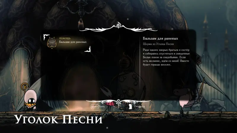 Чтобы квест появился на доске объявлений, требуется сначала открыть локацию «Уголок Песни», что расположена на территории «Хоровых палат». Когда это сделаете, отправляйтесь проходить игру дальше по сюжету. Немного позже, вернувшись в «Уголок песни», появится персонаж Шерма. Поговорите с ним и снова продолжайте проходить игру. При следующем возвращении Шермы уже не будет, а на доске объявлений появится квест — «Бальзам для раненных».