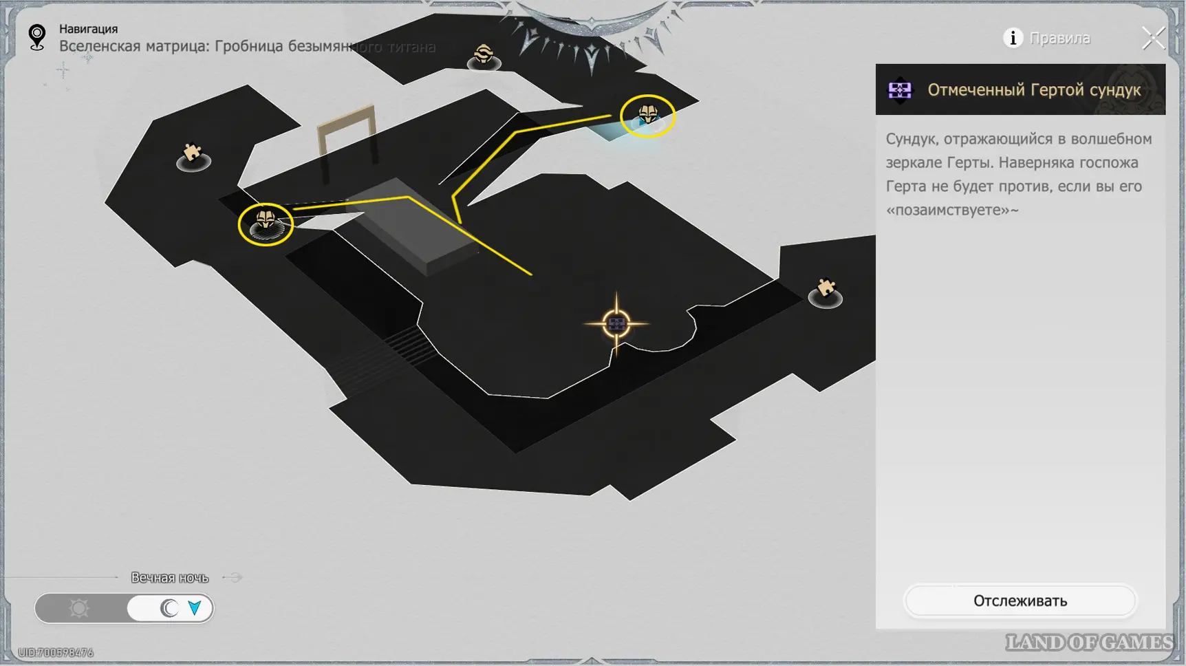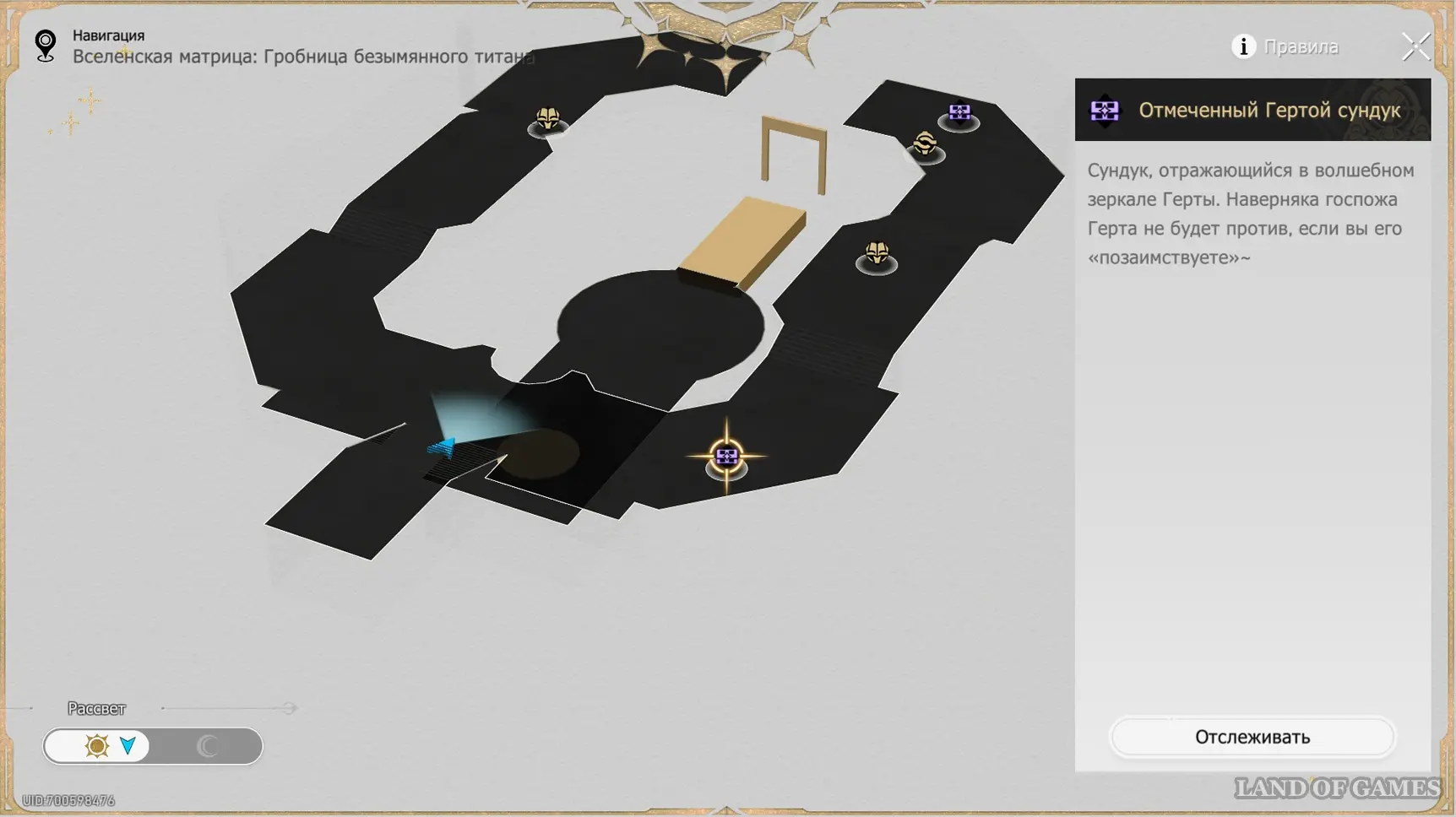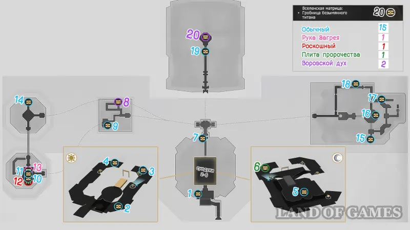 Эта локация состоит из 2-х уровней, в которых можно собрать 20 обычных, ценных и роскошных сундуков. На карте ниже можно будет посмотреть их примерное расположение. Далее мы в деталях расскажем вам, как до них добраться.