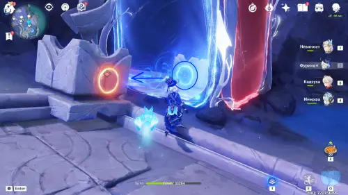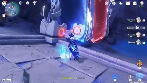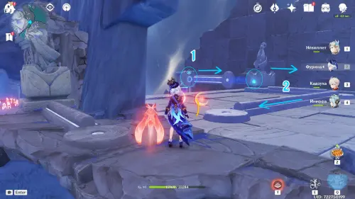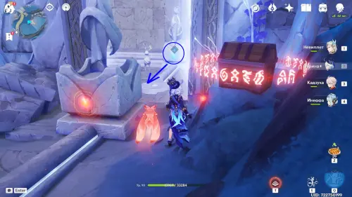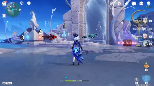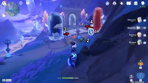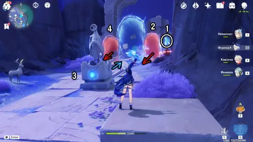 Третья активность находится к северу от Анклава и восточнее Озаренной платформы, очень близко к одному из телепортов. Попав сюда, возьмите в сопровождение синюю куухенки и сразу подтолкните постамент со стороны датчика того же цвета.