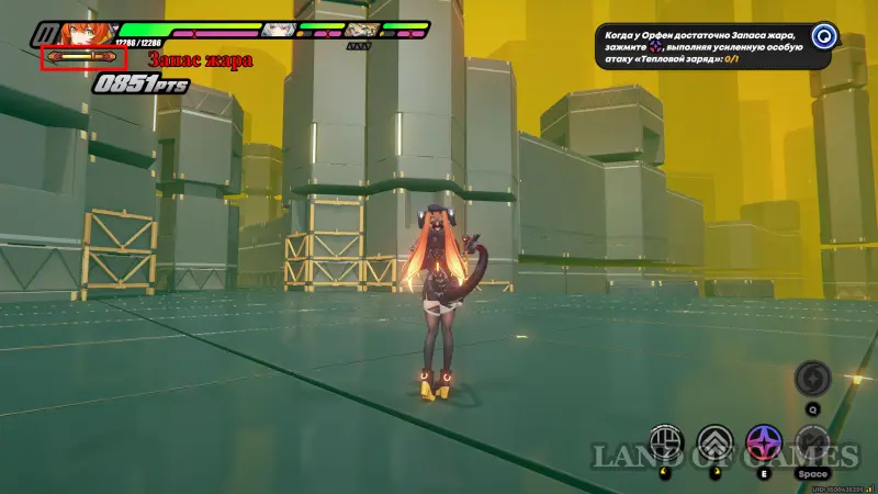 Как можно увидеть, в основном полоска будет заполняться автоматически благодаря атакам из кармана, но вы сможете иногда ускорить ее заполнение, выполняя усиленные Е-шки или цепочки атак. Когда шкала станет оранжево-желтой (вы наберете 100 единиц из 125 возможных), у вас откроется доступ к усиленной особой атаке «Тепловой заряд».