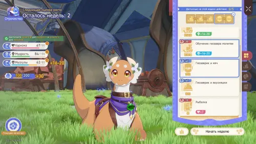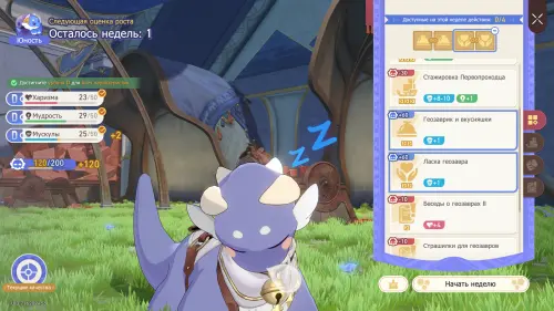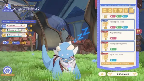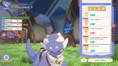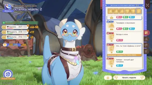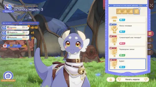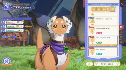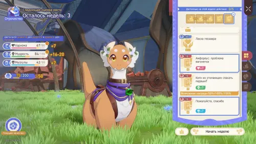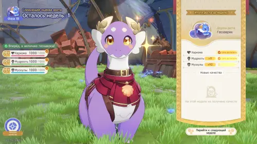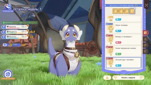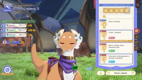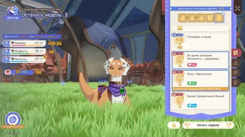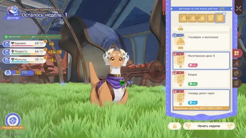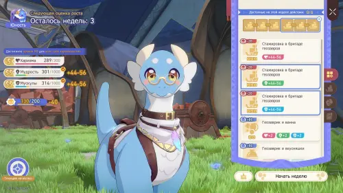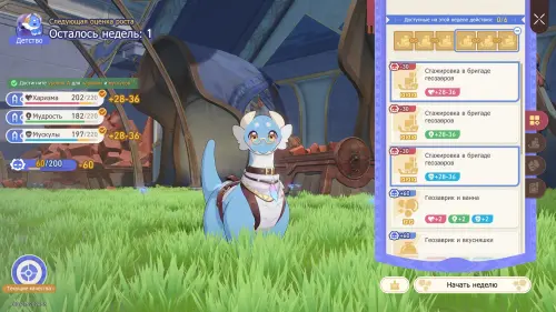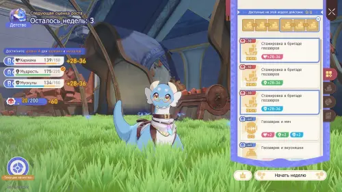 На третьей неделе вы должны будете выполнить все цели, поэтому просто прокачайте те параметры, которые вам кажутся наиболее низкими. Мы выбрали «Стажировка в бригаде геозавров» на повышение Мускулов и Харизмы. Можете снова позволить детенышу самостоятельно пройти испытания. На всякий случай отметим, что химер пробежало 18 штук.