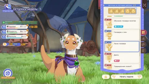 На третьей неделе выберите «Обучение геозавра молитве» на повышение Мудрости, «Молитвенное дело II» и «Геозавр делит пирог». Затем пройдите испытание по выбору блюд. Если вы следовали нашим указаниям, то должны будете получить нужные значения параметров.