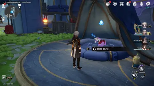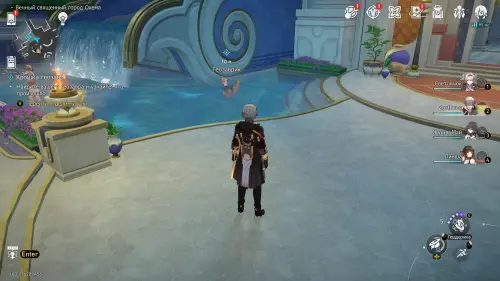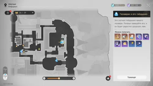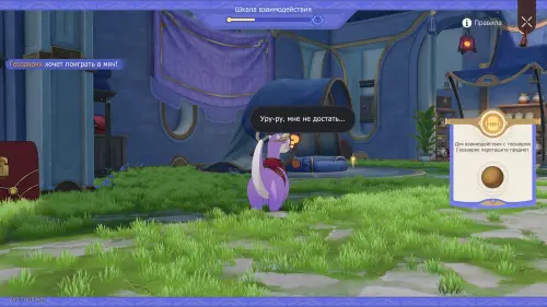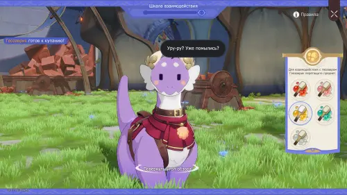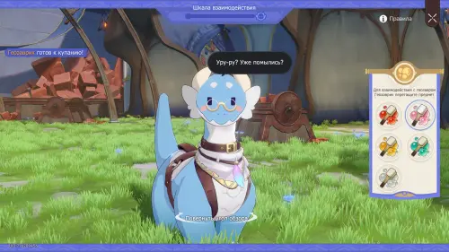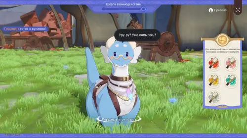 Переместитесь к якорю «Чаша изобилия», а потом подойдите к геозаврику, прячущемуся в воде, и поболтайте с ним. Гляньте небольшой ролик, а потом вновь возьмитесь за воспитание своего геозаврика.