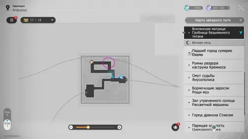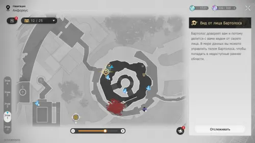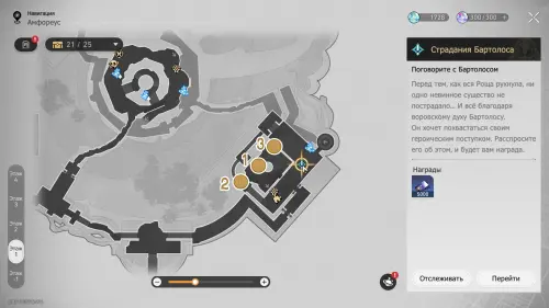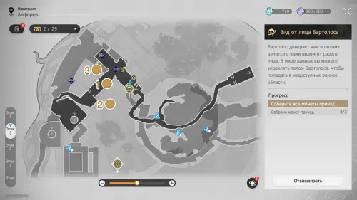 От якоря «Тлеющая бабочка» по центру 3 этажа карты продвигаемся на северо-запад и входим в трехуровневое помещение с порталом Бартолоса (он открывается в рамках сюжетки «О земля, неси страдания всего живого»). Кликнув по метке на карте, можно увидеть, что для получения ценной сокровищницы нужно собрать 3 монетки причуд (все они находятся внутри свинок, летающих в этой области).