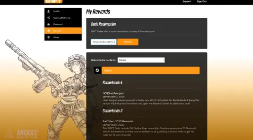 Войдите в игру, а затем откройте меню паузы и нажмите на надпись SHiFT в левой части экрана. Потом перейдите на вкладку «Rewards» (Награды) с иконкой подарка, кликните на текстовое поле и введите в него один из вышеуказанных кодов, а потом нажмите на кнопку «Redeem» (Выполнить). Если вы все сделали правильно, то тут же получите награду.