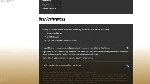 Отметим, что прямо сейчас действует уникальная акция, позволяющая бесплатно получить особый скин для оружия Hazard Pay, если подписаться на рассылку уведомлений от 2K на вышеуказанном сайте. Для этого прокрутите страничку до абзаца «Настройки пользователя» и поставьте галочки возле предложений о получении новостных рассылок от Gearbox.