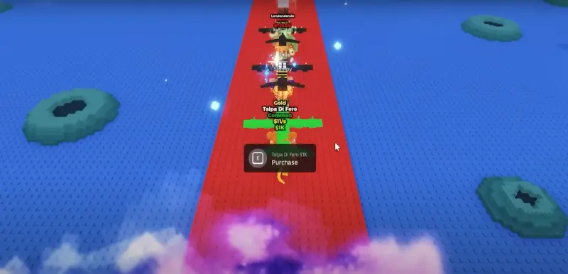 Как осуществить: все становятся в линию на красной дорожке, оставляя небольшие промежутки. Крокодилы начинают тащить игроков вперед, после чего взлетают в небо. Так запускается событие Bombardiro Bombing и появляется бог брейнрота Los Crocodillitos.