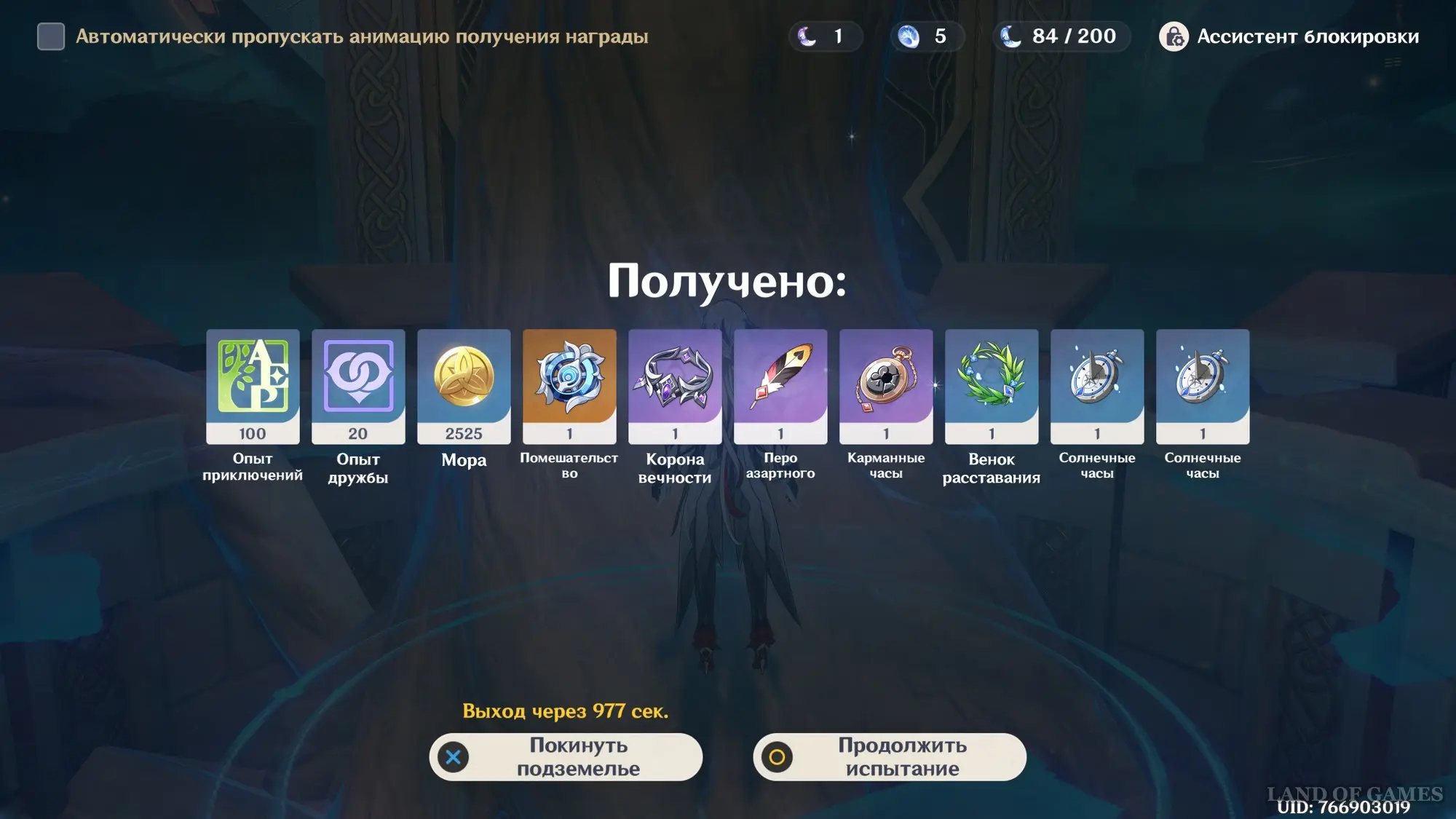 - Вознаграждение: 100 очков приключений, 2025 мора, 20 очков дружбы, сет Азартный игрок (3-4 звезды), сет Решимость временщика (3-4 звезды), сет Серенада шелковой луны (4 звезды) и сет Ночь открытия неба (4 звезды).