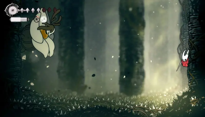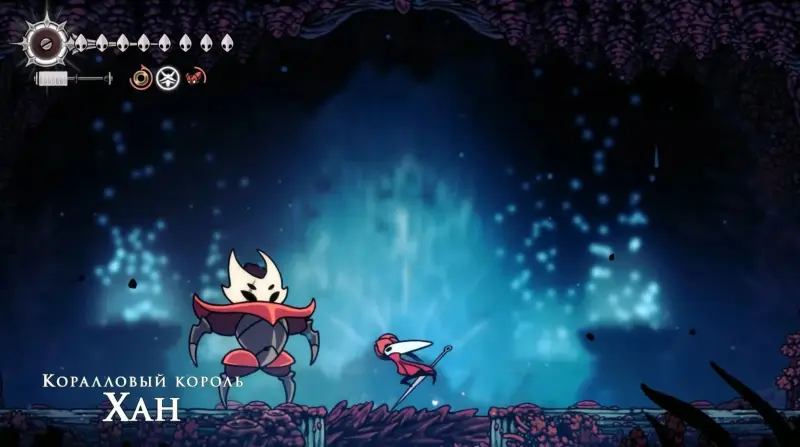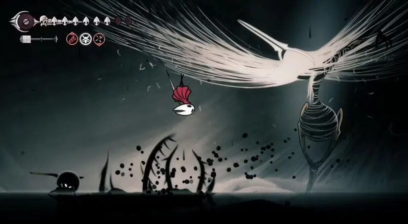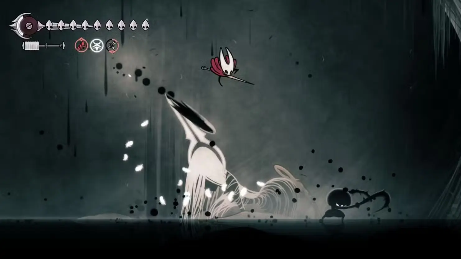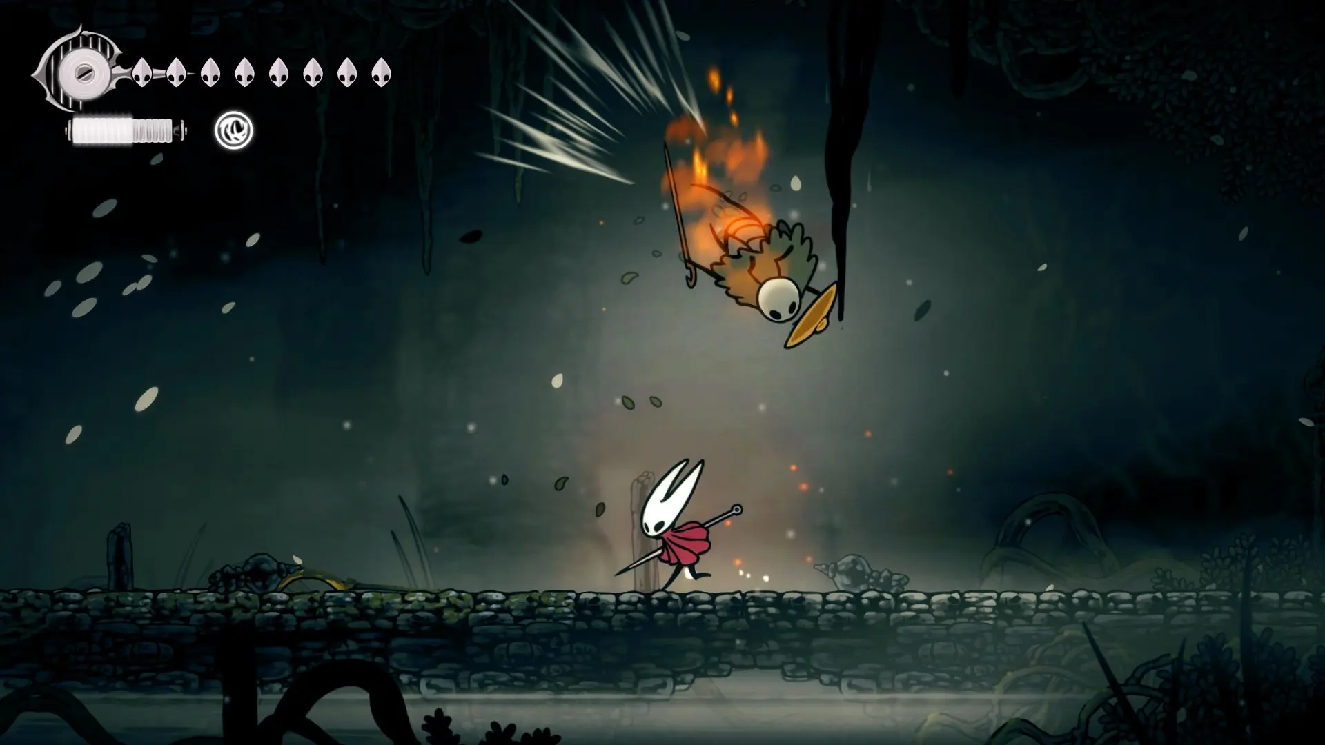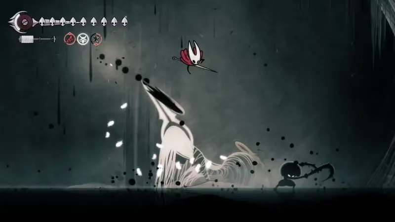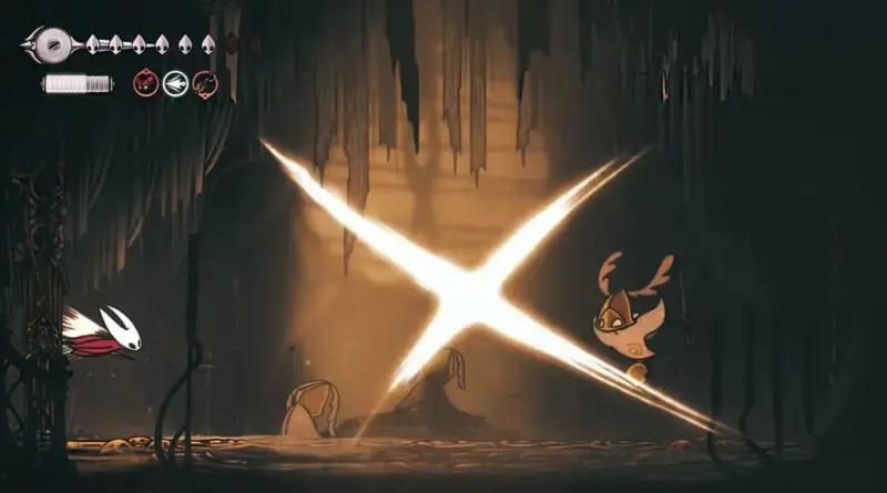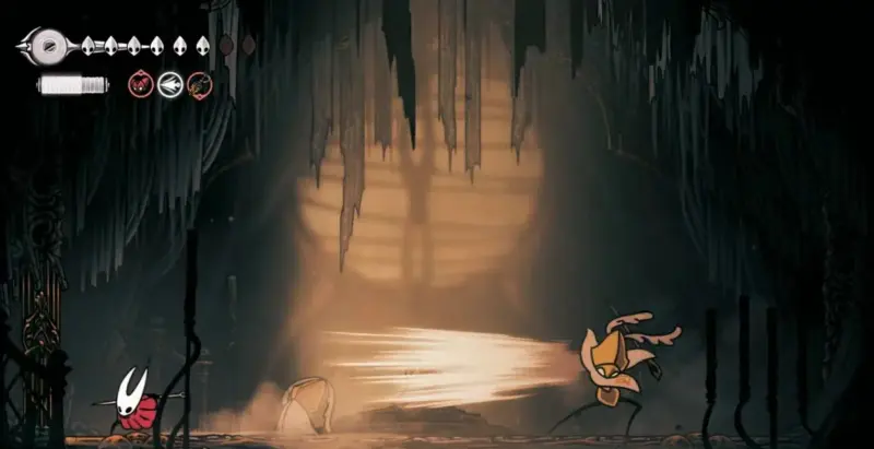 Быстрые уколы. Босс совершает три стремительных укола копьем вперед, продвигаясь с каждым ударом. Перед последним, более длинным уколом, он делает паузу и может развернуться, если Хорнет окажется у него за спиной. Увернитесь с помощью рывка или перепрыгните через него, нанеся сверху пикирующую атаку.