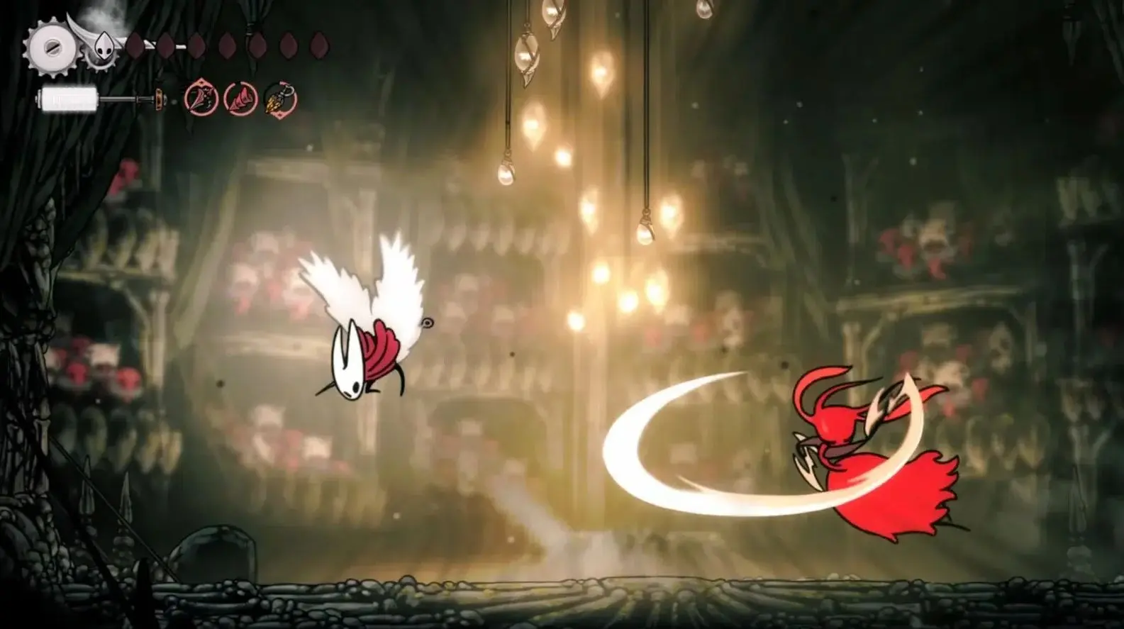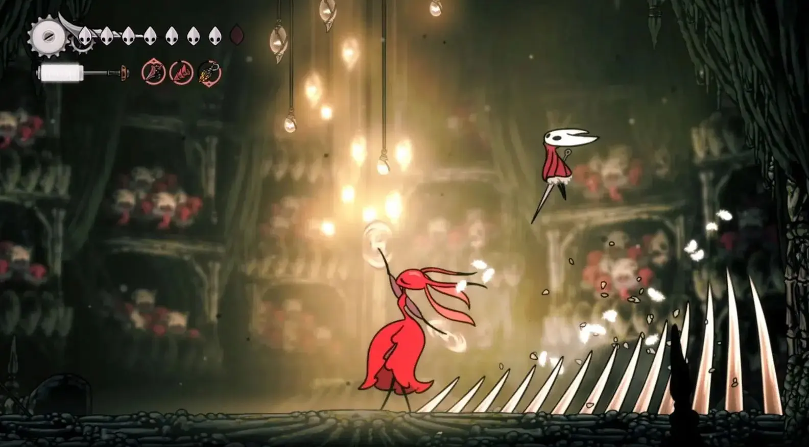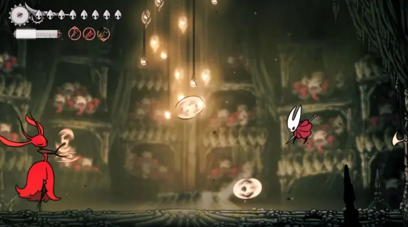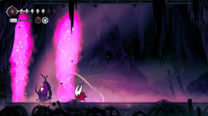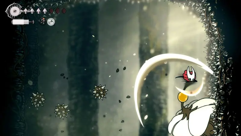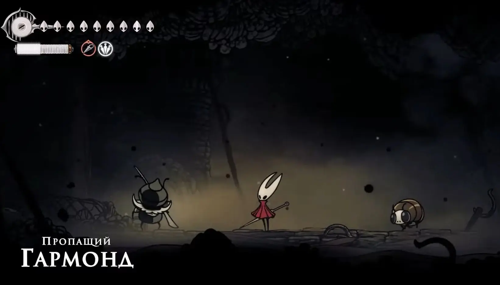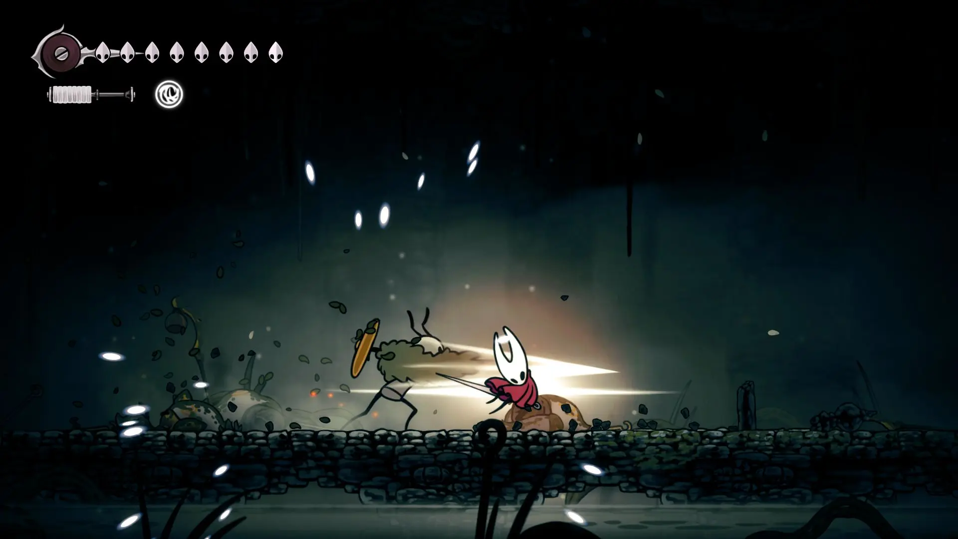Быстрые уколы. Босс совершает три стремительных укола копьем вперед, продвигаясь с каждым ударом. Перед последним, более длинным уколом, он делает паузу и может развернуться, если Хорнет окажется у него за спиной. Увернитесь с помощью рывка или перепрыгните через него, нанеся сверху пикирующую атаку.