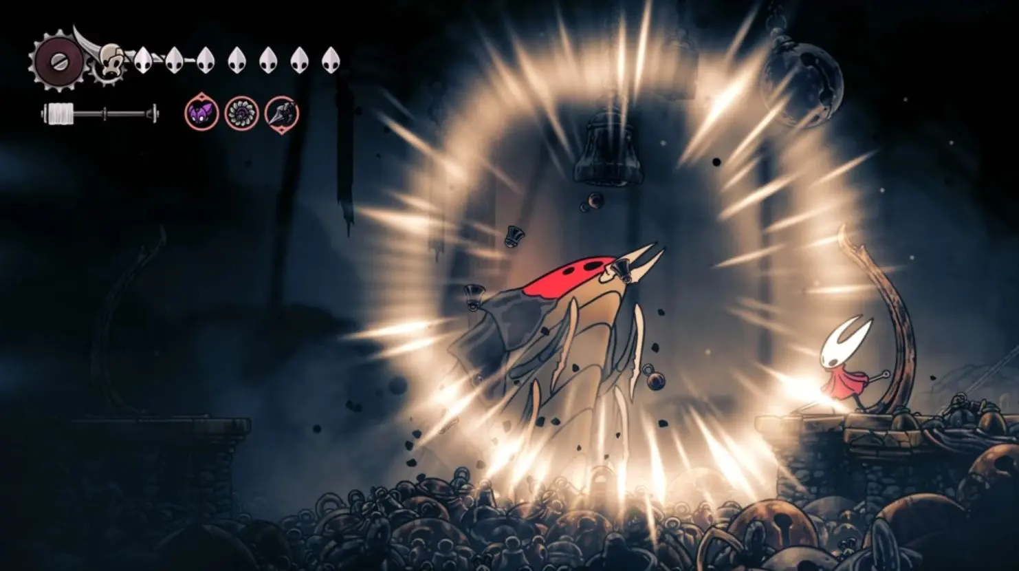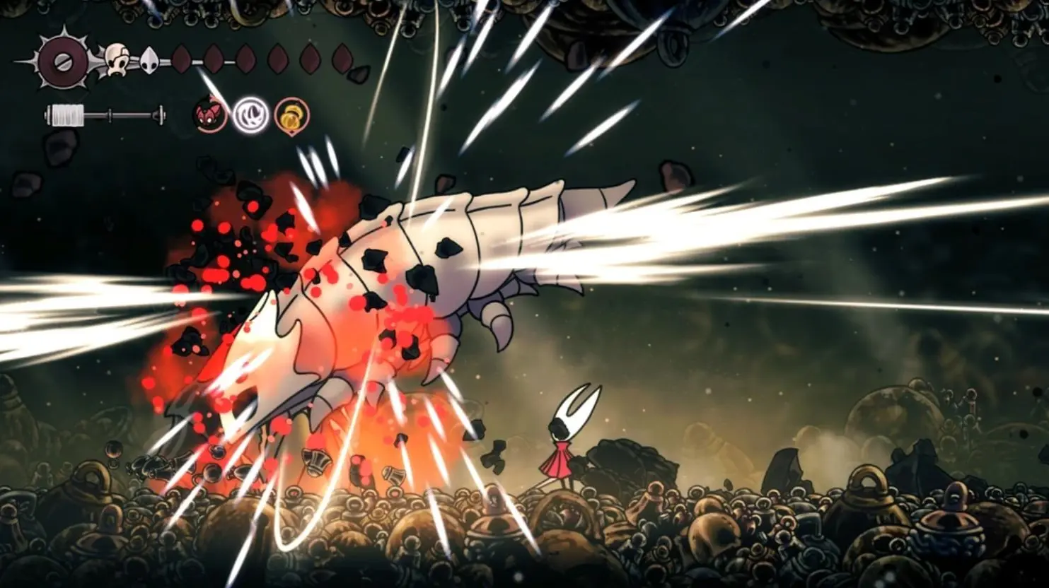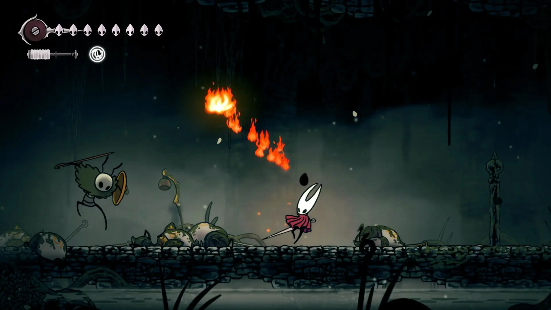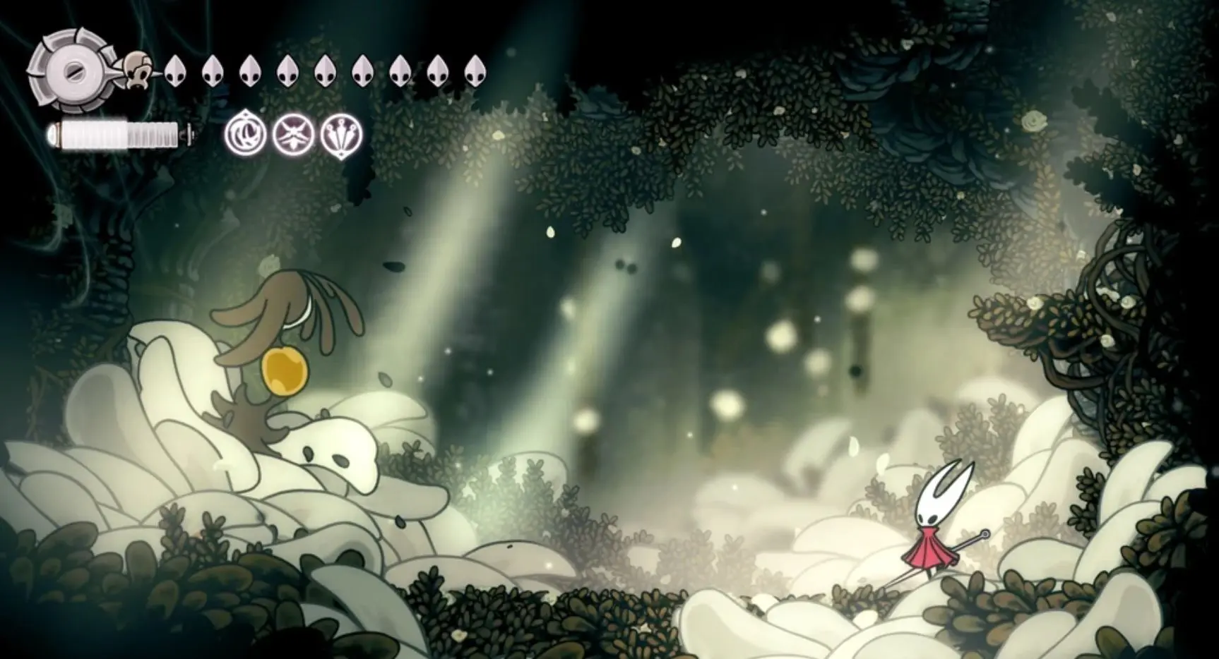 Быстрые уколы. Босс совершает три стремительных укола копьем вперед, продвигаясь с каждым ударом. Перед последним, более длинным уколом, он делает паузу и может развернуться, если Хорнет окажется у него за спиной. Увернитесь с помощью рывка или перепрыгните через него, нанеся сверху пикирующую атаку.