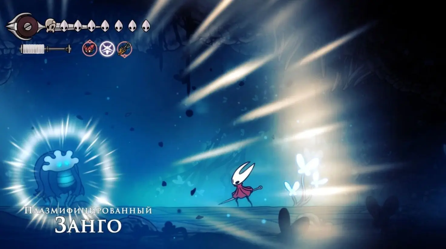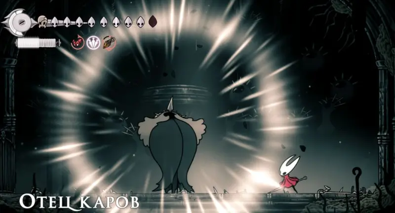 - Стремительный рывок. Босс разгоняется и мчится на вас, пытаясь протаранить Хорнет. Самый эффективный способ — перепрыгнуть через него в последний момент. Пока он проносится под вами, у вас есть идеальная возможность нанести удар в спину. Не пытайтесь уворачиваться в сторону — траектория его рывка может вас задеть.