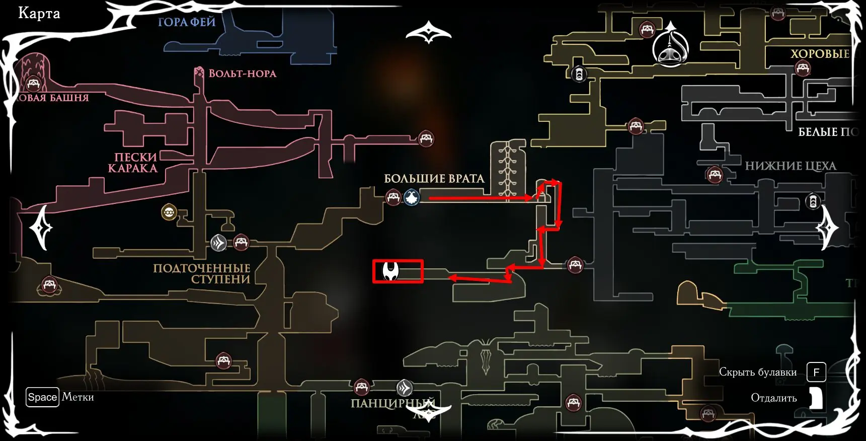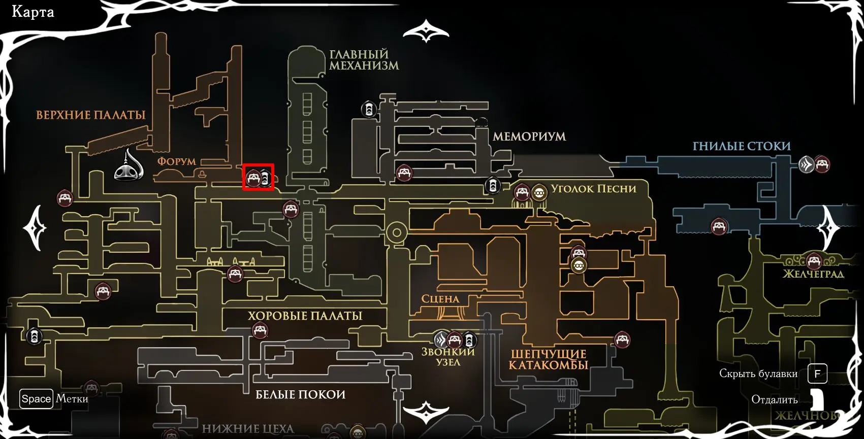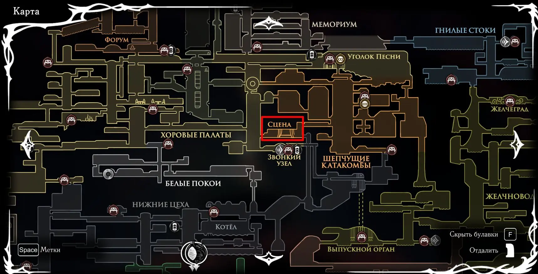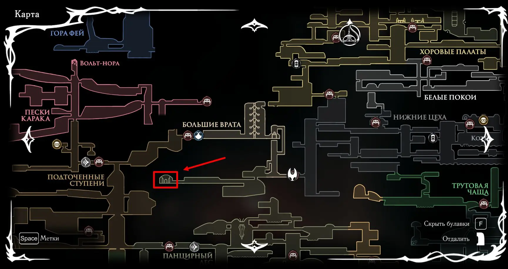 Чтобы начать бой, вам нужно будет использовать способность «Элегия Бездны» на его окаменевшем теле в центре башни. Это перенесет Хорнет в память башни, где вас ждет настоящее испытание — многоуровневая арена, состоящая из нескольких боев с волнами врагов, после чего получите право сразиться с самим королем. Поскольку Хан предпочитает атаковать на расстоянии, ваш набор должен быть сосредоточен на дальнем и пассивном уроне.
