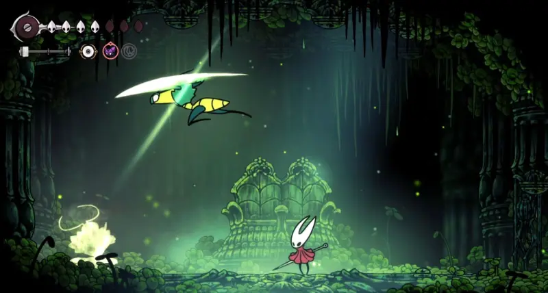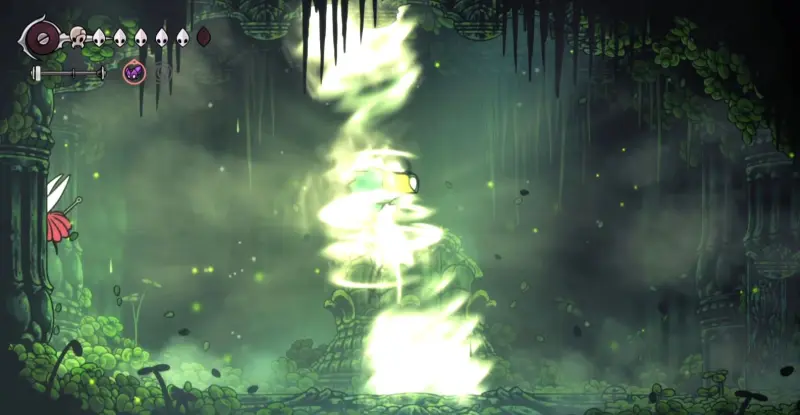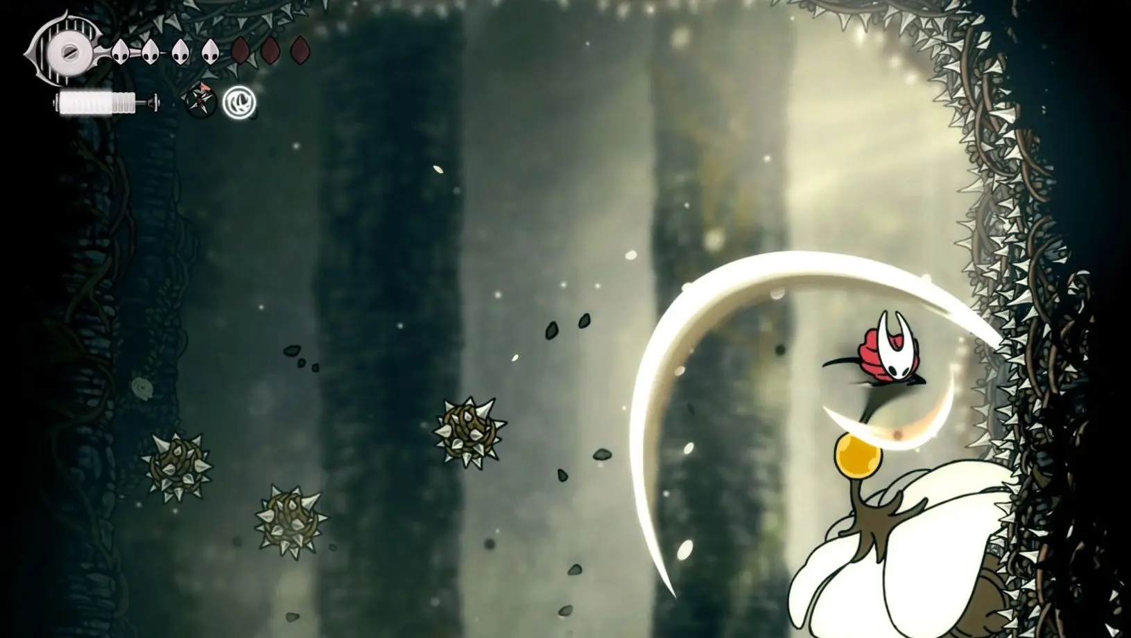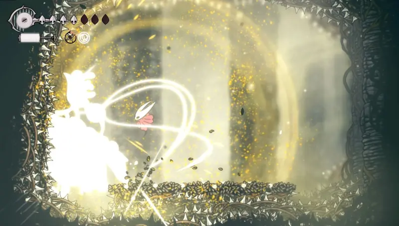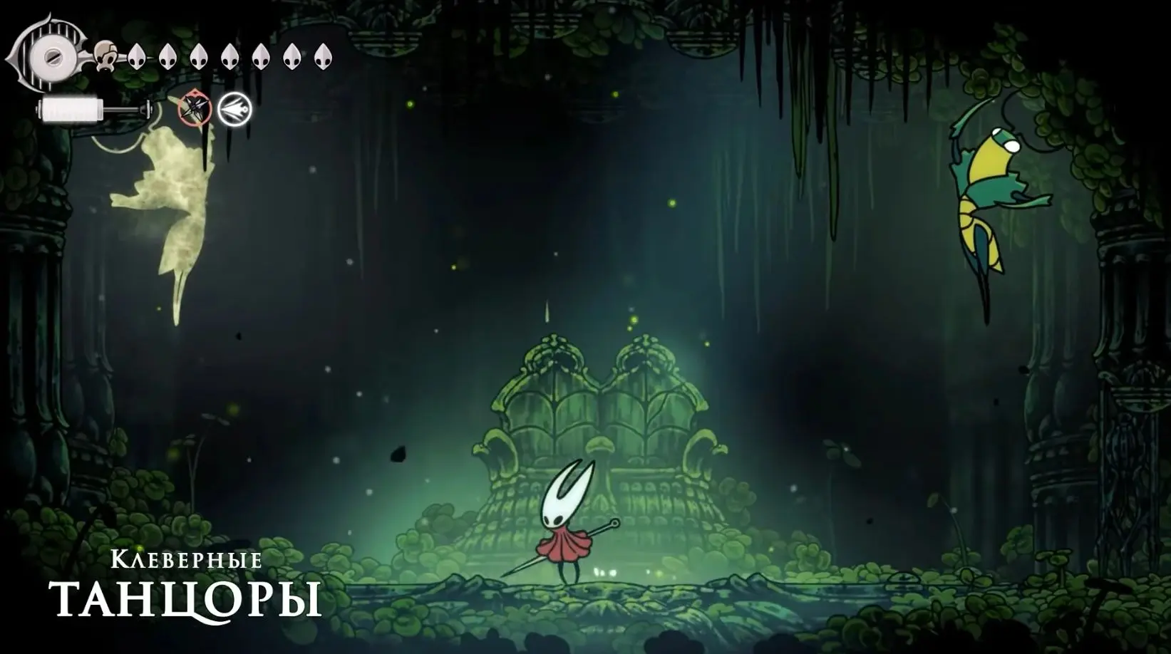 Рывок жалом. Босс зависает у края площадки и стремительно пикирует под углом в 45 градусов, пытаясь поразить Хорнет своим жалом. Если находитесь на небольшом расстоянии, надежным решением будет перепрыгнуть через босса, приземлившись у него за спиной.